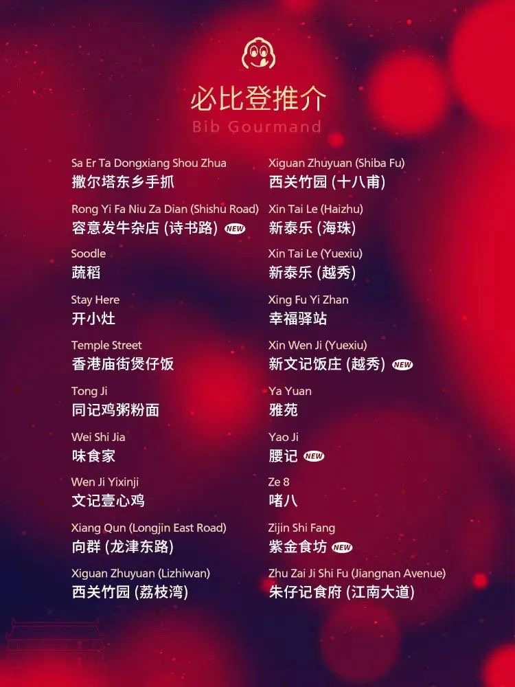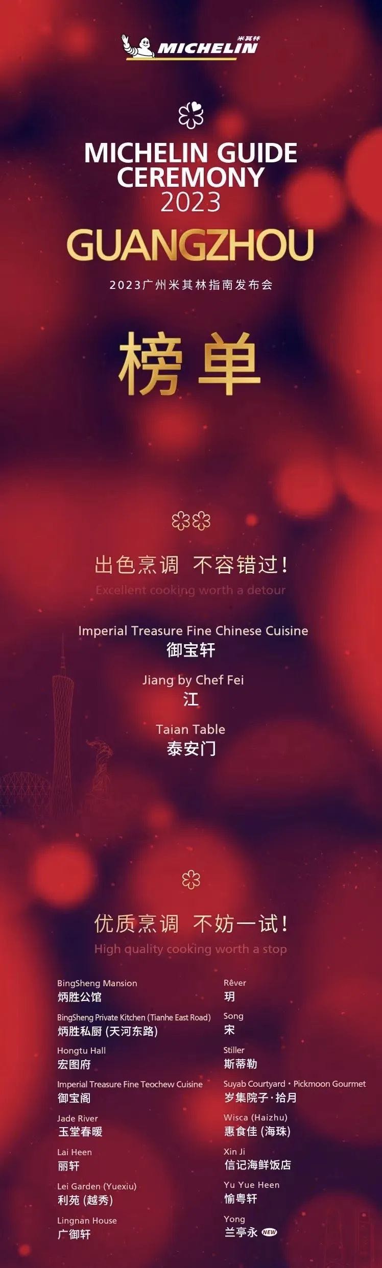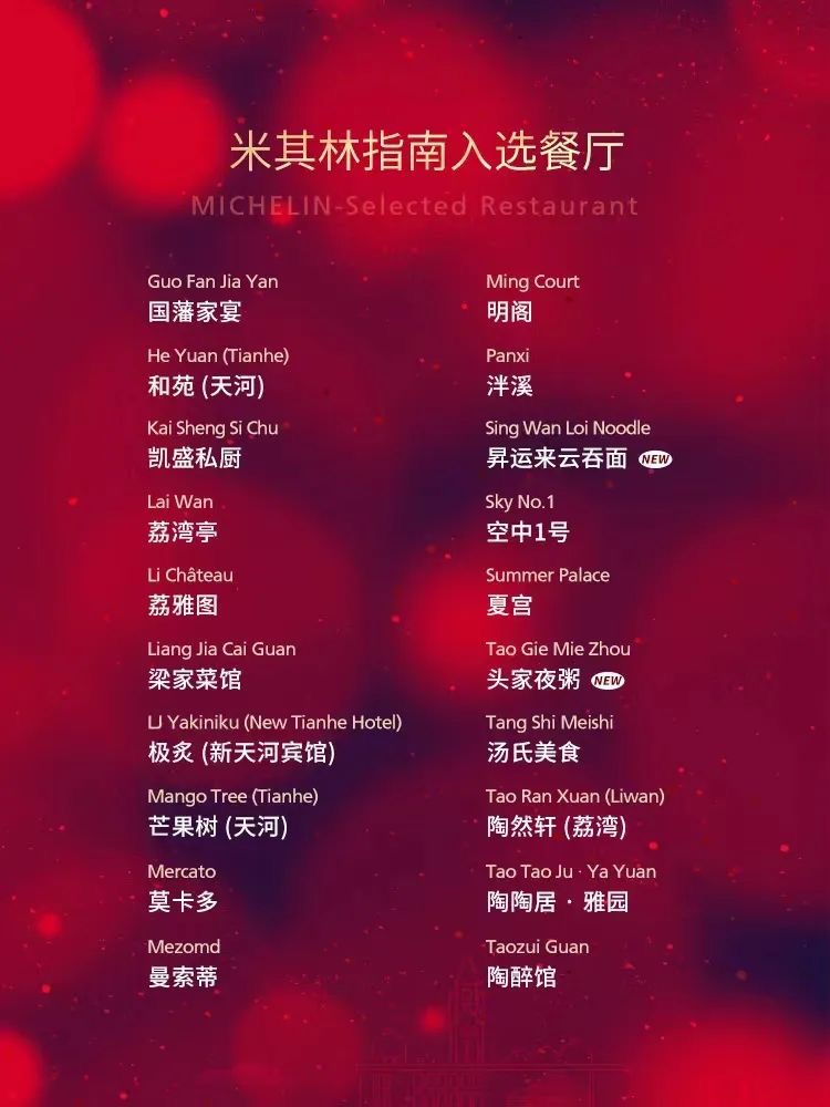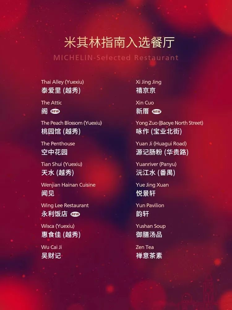 其他与去年相比,并无变化。三星餐厅依旧从缺;二星餐厅仍旧是江餐厅、泰安门和御宝轩;一星餐厅中,去年的15家今年仍旧稳居一星位置,包括提供传统粤菜的炳胜公馆、炳胜私厨 (天河东路)、玉堂春暖、丽轩、利苑 (越秀)、广御轩、惠食佳 (海珠)、信记海鲜饭店、愉粤轩;供应粤式点心的宏图府;潮州菜馆御宝阁和岁集院子·拾月;以及川菜馆宋,时尚法餐厅玥和欧陆菜餐厅斯蒂勒。