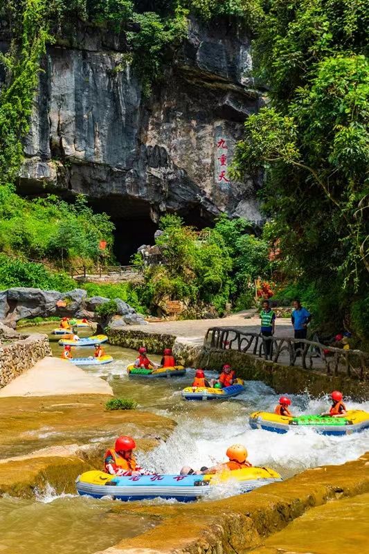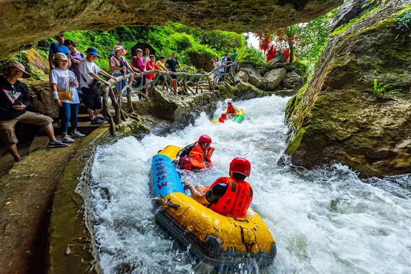 穿越山洞是奇中之奇,岩洞内景色如龙宫,遍布的钟乳石千姿百态,色彩斑斓。老虎谷漂流既能享受到漂流的刺激好玩,又能欣赏到五光十色的地下岩洞奇观。体验过后,心灵深处感受到了一次甘畅淋漓的释放。