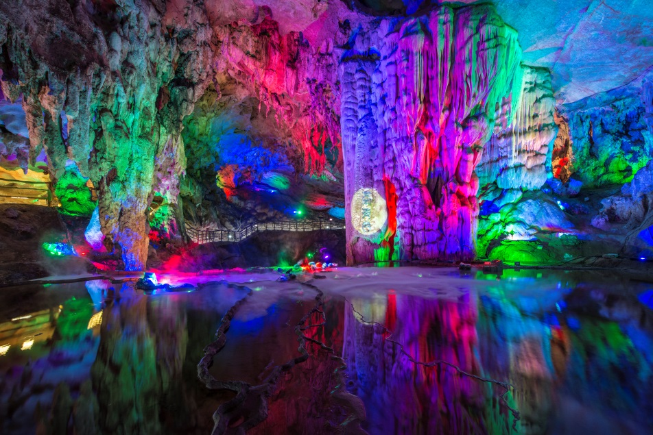 九重天景区是一个藏在大山里的溶洞,搭配着人工的灯光,折射出五彩斑斓的石景。整个溶洞不算很大,只需花上那么半个小时便能游完。夏天欣赏溶洞的一大好处在于溶洞内气温适宜,十分凉爽,就像一个天然的空调,走着走着,热气与汗水就全抛到脑后了。