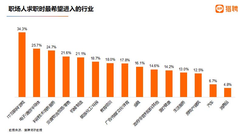 当被调研职场人被问到求职时最希望进入哪些行业,IT/互联网/游戏以34.3%的得票率位居第一;电子/通信/半导体以25.7%的得票率位居第二;科研技术/商务服务、交通/物流/贸易/零售、机械/制造位居第三至第五。