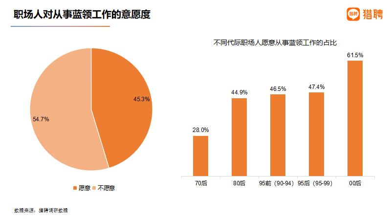 被调研职场人中,45.3%愿意从事蓝领工作。分代际来看,70后愿意从事蓝领工作的占比最少,仅为28%;80后次之,以44.9%的占比位居第二;95前、95后分别以46.5%、47.4%的占比位居第三、第四;00后愿意从事蓝领工作占比最多,占比超六成。