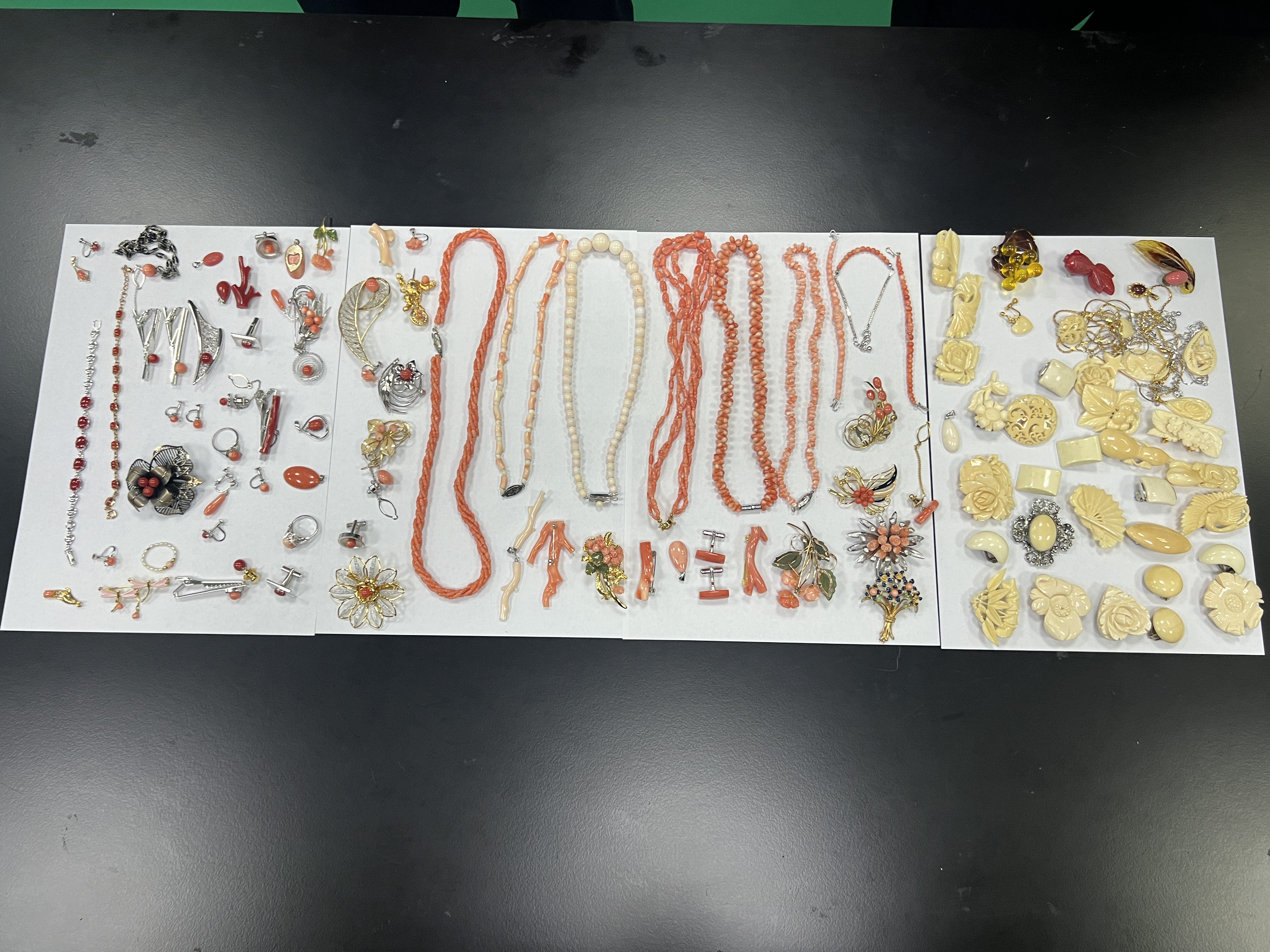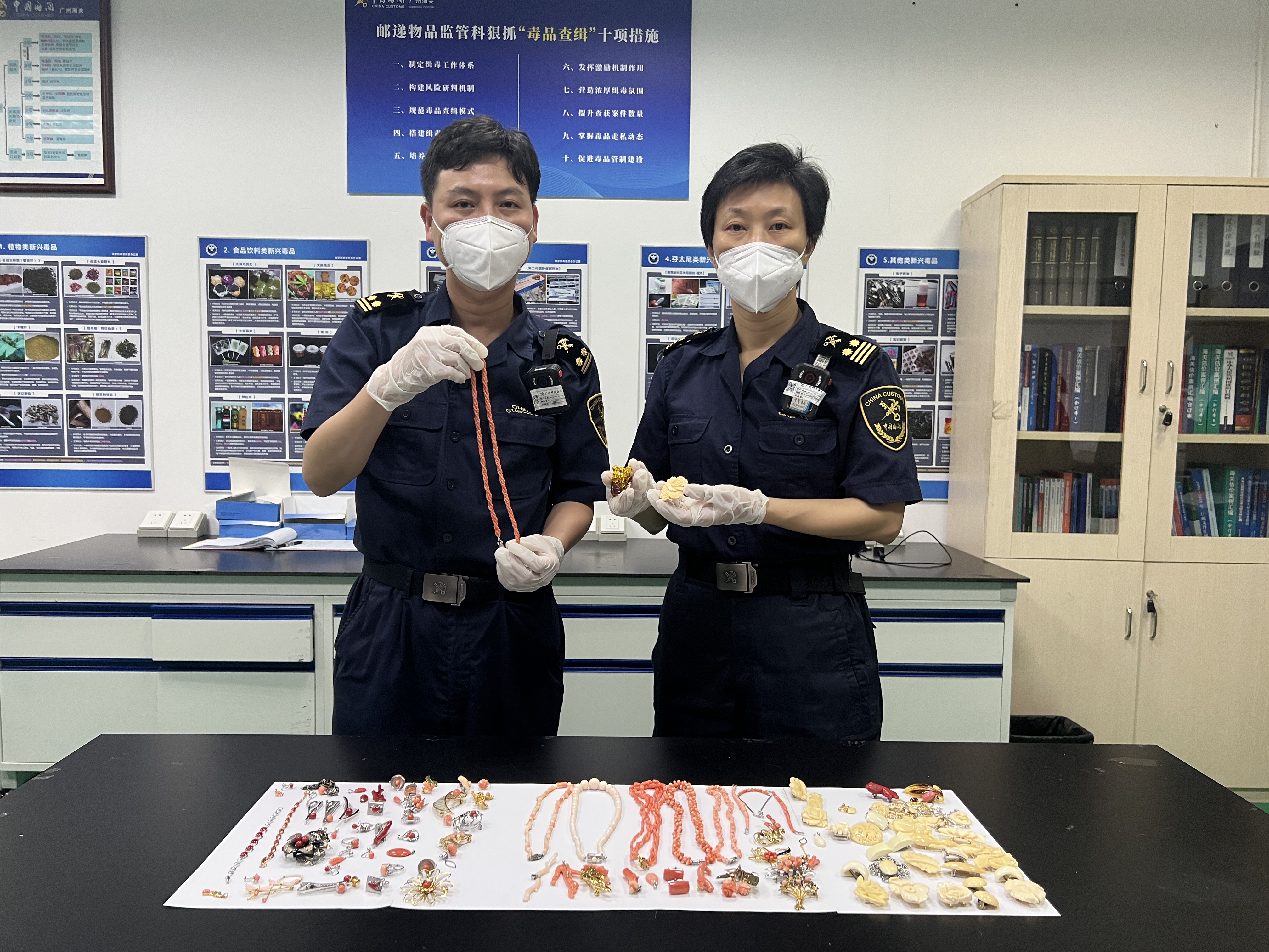 此前,广州海关所属广州邮局海关关员在对1件进境邮件进行查验时,发现邮件为满满一箱的首饰,包括串珠项链、挂坠、耳饰和戒指等,共计92件。这些饰品雕刻精细,有的呈粉红色、表面有蜡状光泽,疑似为珊瑚制品;有的呈乳白色,表面骨质纹路清晰,带有象牙特有的“利兹纹”。