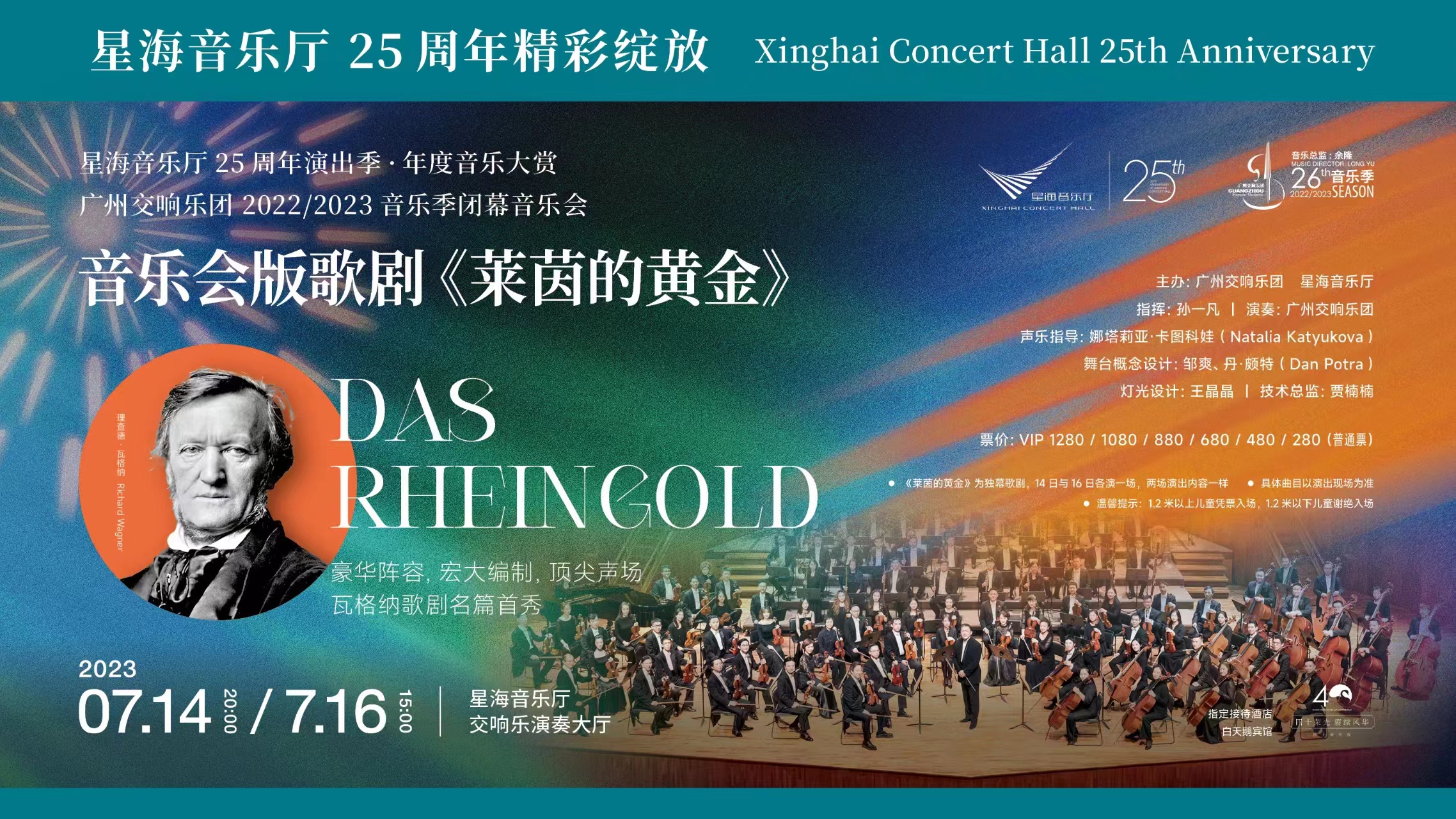 作为星海音乐厅25周年演出季“年度音乐大赏”重磅演出,以及广州交响乐团2022/2023音乐季的闭幕音乐会,音乐会版歌剧《莱茵的黄金》由广州交响乐团、星海音乐厅携手著名指挥家余隆共同策划,才华横溢的青年指挥家孙一凡执棒,汇集来自海内外多达14位著名歌剧表演艺术家,同一套节目即将于7月14和16日两天上演两场,在星海音乐厅掀起歌剧巨浪。