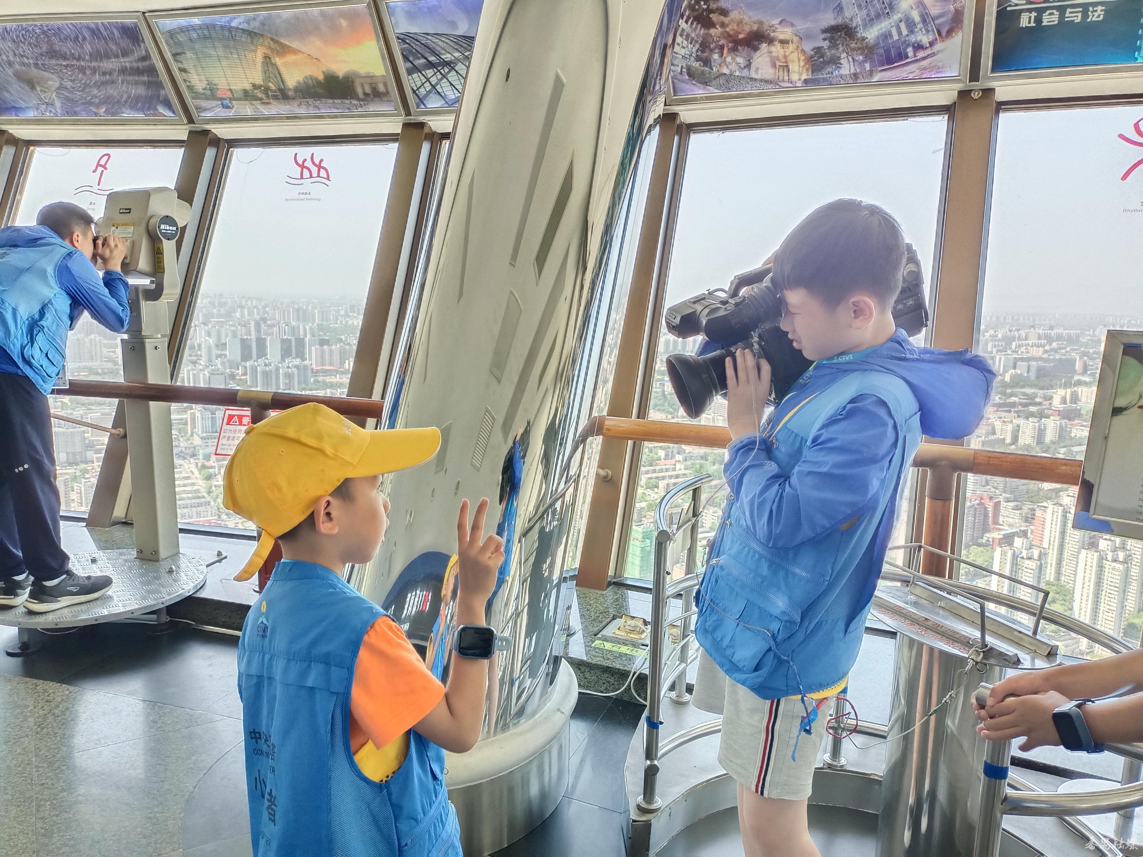 早上7点30分,小学员登车出发前往中央电视塔。中央电视塔是集广播电视发射和旅游观光、娱乐为一体的综合性建筑,是北京现代化的一个重要标志。小学员们穿上采访马甲、佩戴采访证,化身成为一名小记者。在讲解员的带领下,他们参观了新中国著名英模人物展,了解了王进喜、焦裕禄、雷锋等英模的先进事迹。小记者们还登上塔顶看北京城全景,高楼林立的城市景观尽收眼底。接着,小记者们走进电视文化大厅,跟随大记者学习电视节目的制作与传播方式,小记者拿起摄像机、坐上新闻联播的主播台,体验新闻报道工作。随后,研学团一行到军事博物馆拍照“打卡”。