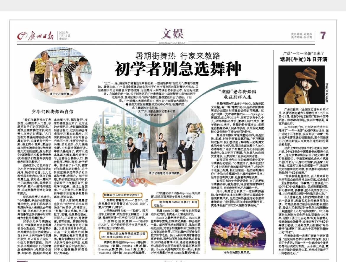 “三二一,走,跳起来!”随着音乐声响起来,一群萌娃瞬间“起范儿”,跟着节奏舞动。暑假来临,广州日报全媒体记者来到位于广州市海珠区的某街舞艺术机构,只见街舞少年正跟随音乐节拍练舞,时而是令人眼花缭乱的手部动作,时而贴地旋转。在城市的另一端,位于越秀区的广州市青年文化宫街舞青少年特训班于近期开课,荔湾区青少儿“候鸟”街舞公益课堂也开启了报名。7月底,广州街舞艺术周也将在广州市文化馆新馆大剧场与粤港澳大湾区街舞潮流文化中心举行,街舞俨然成了暑期的关注热点。