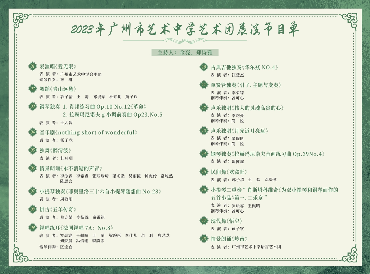 华光幻彩,雅韵传承文明;瑰丽艺境,经典浸润人生。近日,“幻彩韵流,艺境之悠”2023年广州市艺术中学艺术团展演晚会在广东粤剧院举行。作为广州市教育局直属艺术类公办普通高中,艺中学生用他们专业的审美,为大家献上一场弘扬传统文化、集视听觉艺术于一体的艺术盛宴。