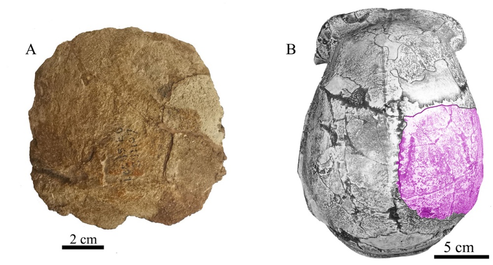 周口店第15地点发现的人类顶骨化石。A:顶骨化石外侧面观;B:顶骨化石与周口店直立人头盖骨的右侧顶骨大致重叠。(中国科学院古脊椎动物与古人类研究所供图)