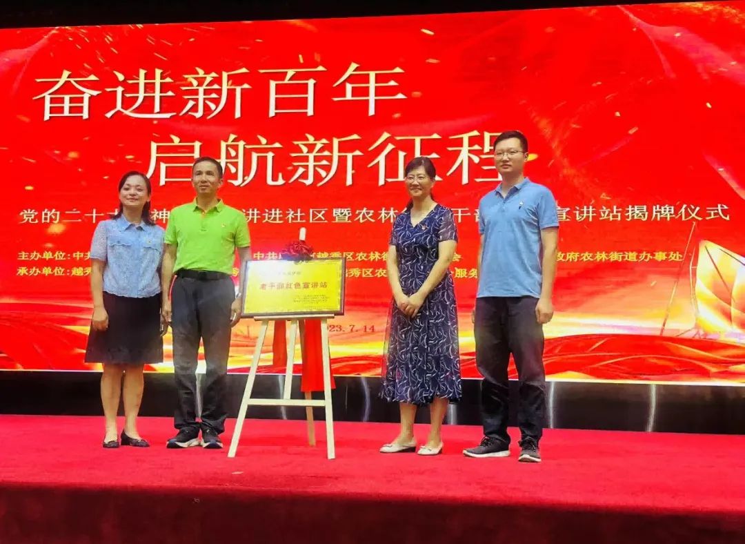 7月14日下午,由越秀区委老干部局、农林街党工委、农林街道办事处主办,越秀区老干部活动中心、越秀区老干部大学、越秀区农林街道综合服务中心协办的“奋进新百年 启航新征程”党的二十大精神宣讲进社区暨农林街老干部红色宣讲站揭牌仪式活动在东山宾馆会议中心举行。