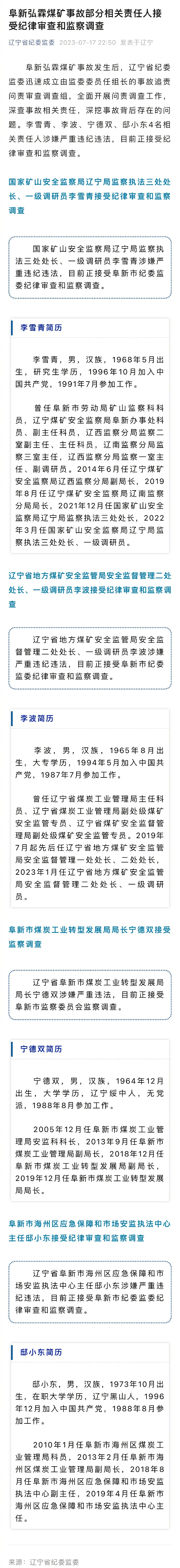 辽宁省纪委监委微信公众号7月17日通报,阜新弘霖煤矿事故发生后,辽宁省纪委监委迅速成立由监委委员任组长的事故追责问责审查调查组,全面开展问责调查工作,深查事故相关责任,深挖事故背后存在的问题。李雪青、李波、宁德双、邸小东4名相关责任人涉嫌严重违纪违法,目前正接受纪律审查和监察调查。