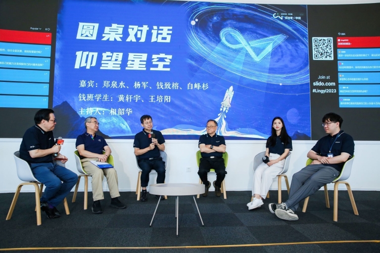 随后,深圳零一学院讲座教授、联合创始人相韶华担任主持,郑泉水院士、杨军院士,以及零一学院特聘高级顾问、前香港科技大学创始副校长、美国约翰霍普金斯大学资深教授钱致榕,深圳零一学院副院长、清华大学教授白峰杉,与清华钱班学生黄轩宇、王培阳,共同围绕“仰望星空”主题展开圆桌对话。深圳零一学院联合创始人,清华大学行健书院副院长、副教授徐芦平还给同学们介绍了选择专业和兴趣的方法。
