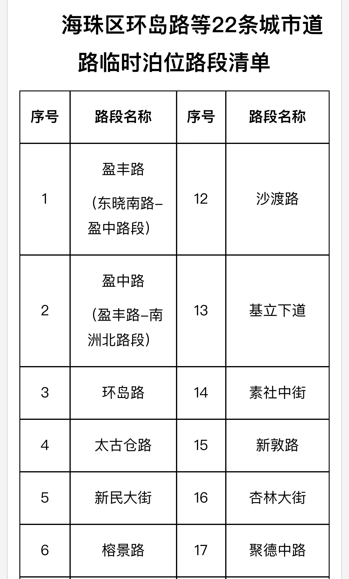 通告提到,根据《广州市停车场条例》有关规定,海珠区环岛路等22条城市道路临时泊位路段将由原经营单位移交市交通运输局管理。自2023年7月20日起,市交通运输局将结合原经营单位移交筹备情况,逐条接管上述路段城市道路临时泊位,并由市道路事务中心按照中心六区城市道路临时泊位设置规划进行优化调整,逐条开展泊位及相关设备设施改造施工工程。