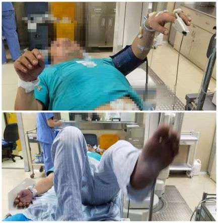 ▲术后即刻陈先生瘫痪的左侧肢体便可抬离床面