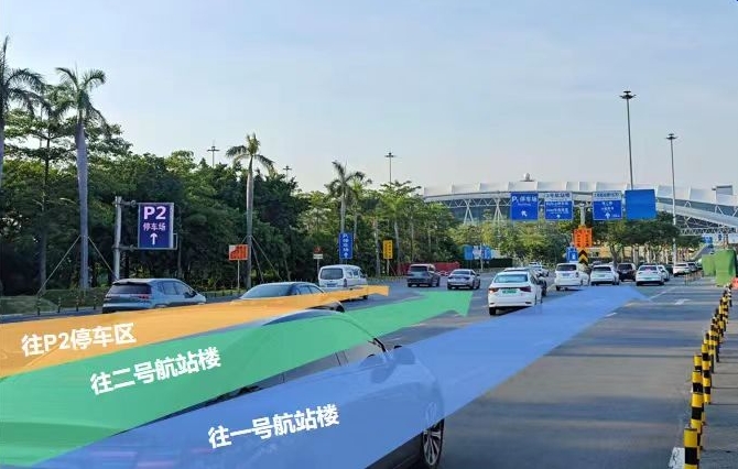 机场大道东自南向北行驶车辆,前往P2停车区请靠左侧车道行驶,前往T1航站楼请靠右侧车道行驶,前往T2航站楼请往中间车道行驶。