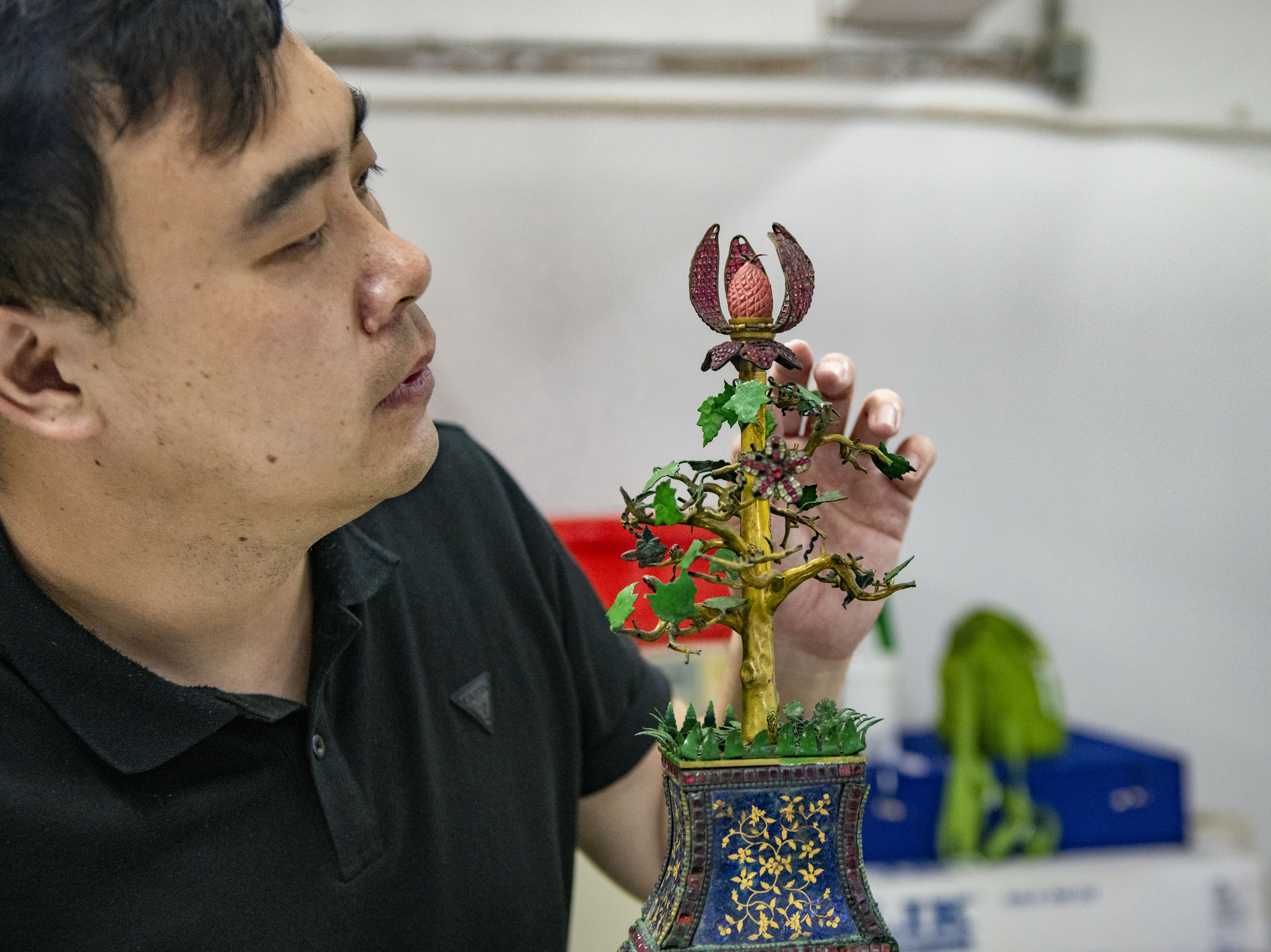 在修复过程中,该钟被有序地拆分成约200个零件。专家介绍,复杂工艺的交叉应用,甚至是在一座钟表上炫技式的多种工艺叠加,是广钟区别于西洋钟表、宫廷做钟处钟表、苏钟的显著标志。根据当时的史料我们可以得知,广钟外壳、夹板、齿轮可以去登龙街、状元坊、油栏门订制;钟表上的玻璃配件和水法装置,可以去永兴大街的仁信吹玻璃铺或杨巷泰源玻璃铺;此外“打铜街的泰盛洋瓷店,工匠会在铜器上描绘各式图案。元锡巷和临近的街都被象牙和檀香木雕刻工匠占据,他们用最简单的钢笔或铁笔那样的工具精巧地雕刻。他们刻象牙胸针、同心球、棋子等物品。宝石商们则住在福星街和长兴街,与这条街相邻的街道居住着被雇来制作玻璃手镯的艺术家。玻璃被制作成天然玉石的模样,精美到能以假乱真,有时也会添加颜色,制作出红、绿、蓝等颜色,这里能订购广钟上精美绚丽的料石。”