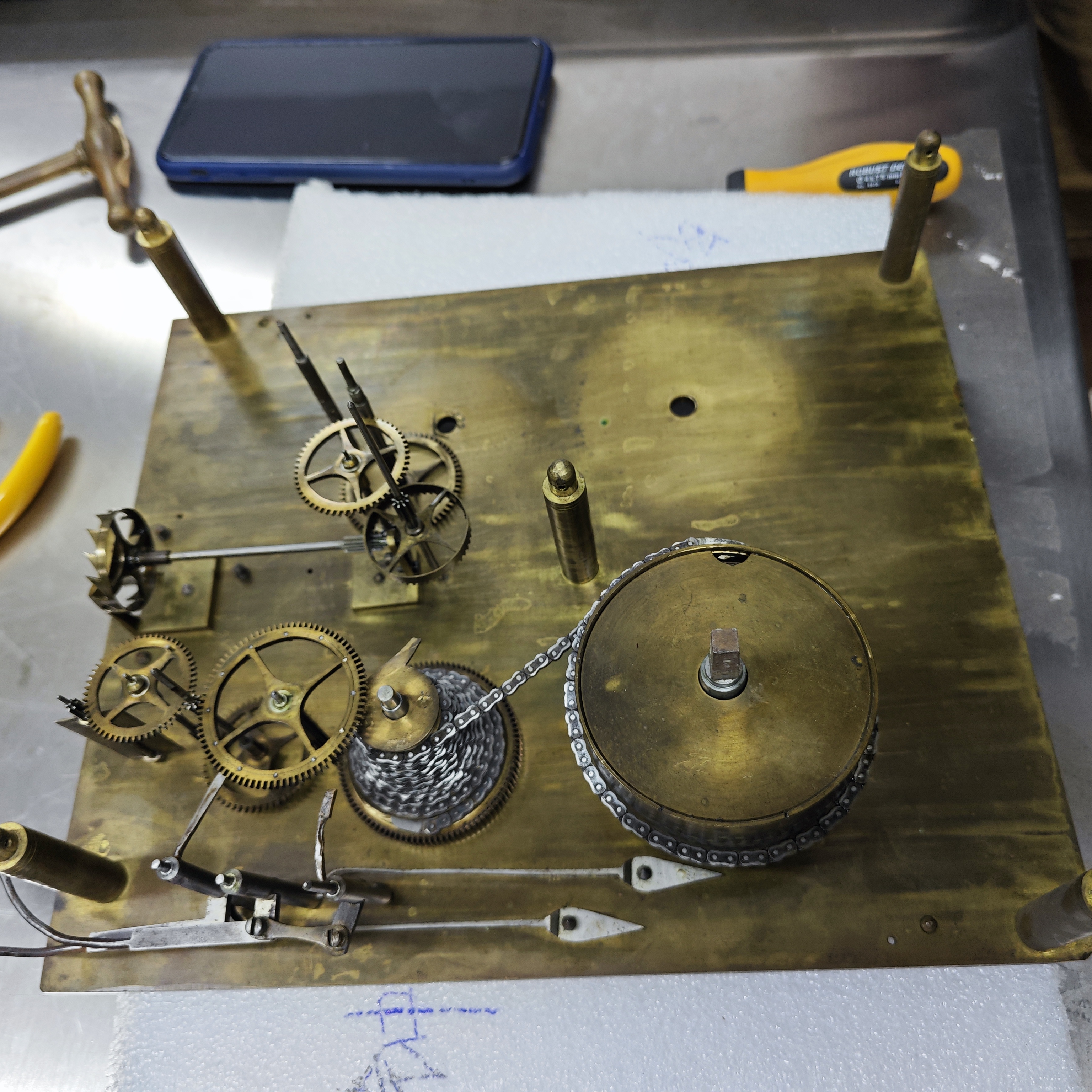 比如馆藏铜镀金珐琅瓶变字转花开花钟,是典型的清乾隆时期广钟,共分三层,底层内置机械装置,正面居中为三针时钟,钟盘左右两侧各设一朵料石转花。二层箱体正面为四字转动吉语:“喜报长春”“福与天齐”“福禄万年”“太平共乐”,平台四角各立一瓶状转花。上层为蓝透明珐琅双铺首衔环扁瓶,瓶体饰金色八宝图案和卷草纹,瓶腹中央圆形玻璃开窗内嵌变色料石转花,花瓣形状、颜色均可变换,有红、绿、黄、蓝四色。瓶顶中插一花树,顶花可开合。在清洗它的机芯时,由于锈蚀,某些零件无法拆卸,需用煤油浸泡待松动再分离,最后用铜刷轻刷去除零件上的锈。由于修复工作安排紧凑,临时购置铜刷会减缓进度。钟表保管员突然想起文物库房钟表存放架处有两个大信封,一直跟这座钟存放在一起。当即入库取出大信封,只见一个写着广钟钥匙,内装十几枚钥匙。另一个写着“广钟工具”的信封里装有6个小信封,其中1个故宫博物院小信封内装着铜丝、丝弦等工具,另外5个广州博物馆小信封上各写着物品名称和用途。