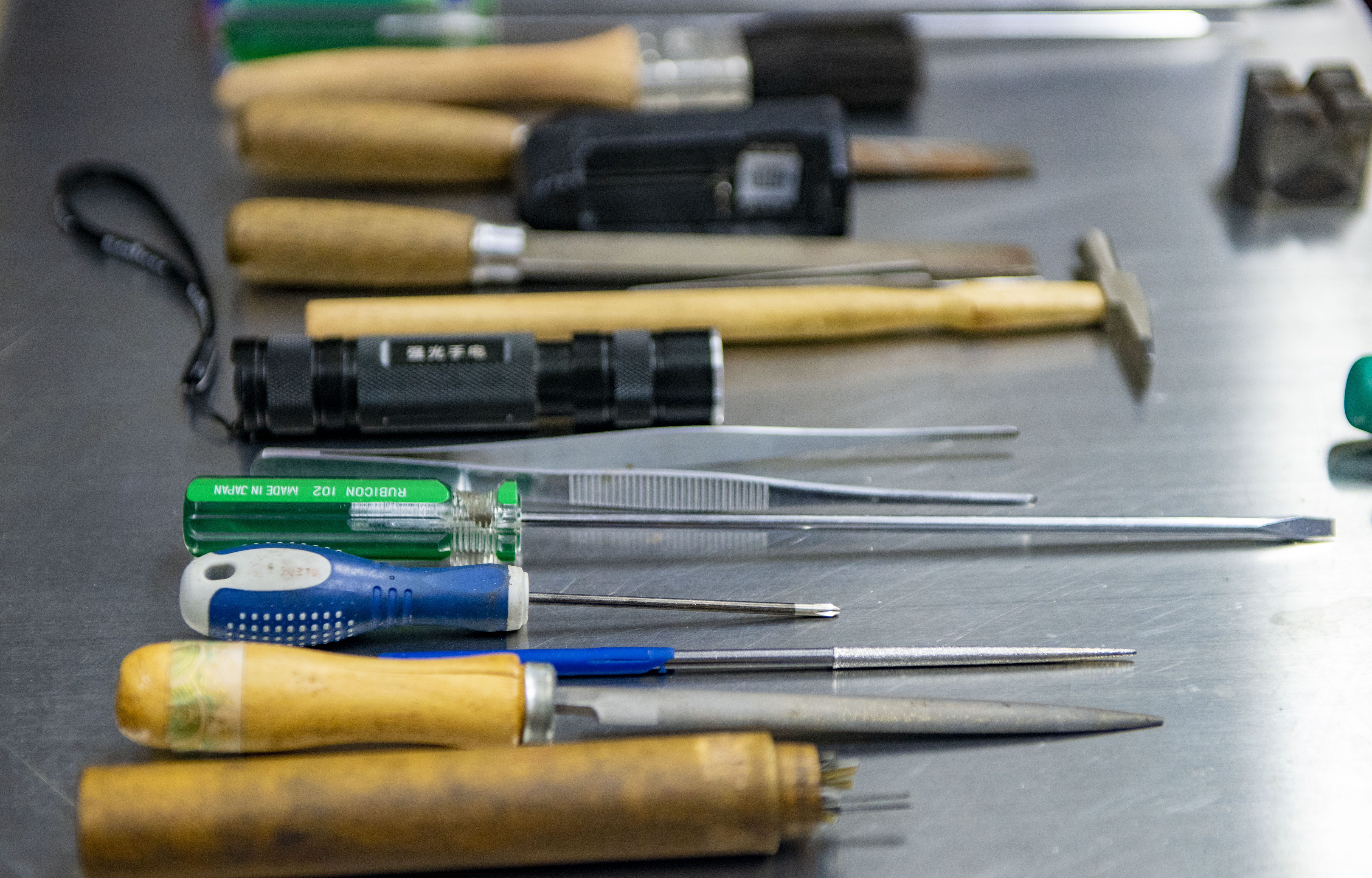 据广州博物馆已退休的前辈们回忆,1982年12月,馆方曾邀请王津老师跟他师傅一行4人来广州修复广钟。当时条件非常有限,修复组在镇海楼一层大厅的右侧拉了一个屏风作为隔断,后面摆上两张写字台,就成了临时修复区。这些修复工具可能是40年前那次修复工作留下来的,在完成修复工作后,当时的修复人员细心地整理好修复工具,并写上用途,文物保管员则将其一代延续一代保存至今。