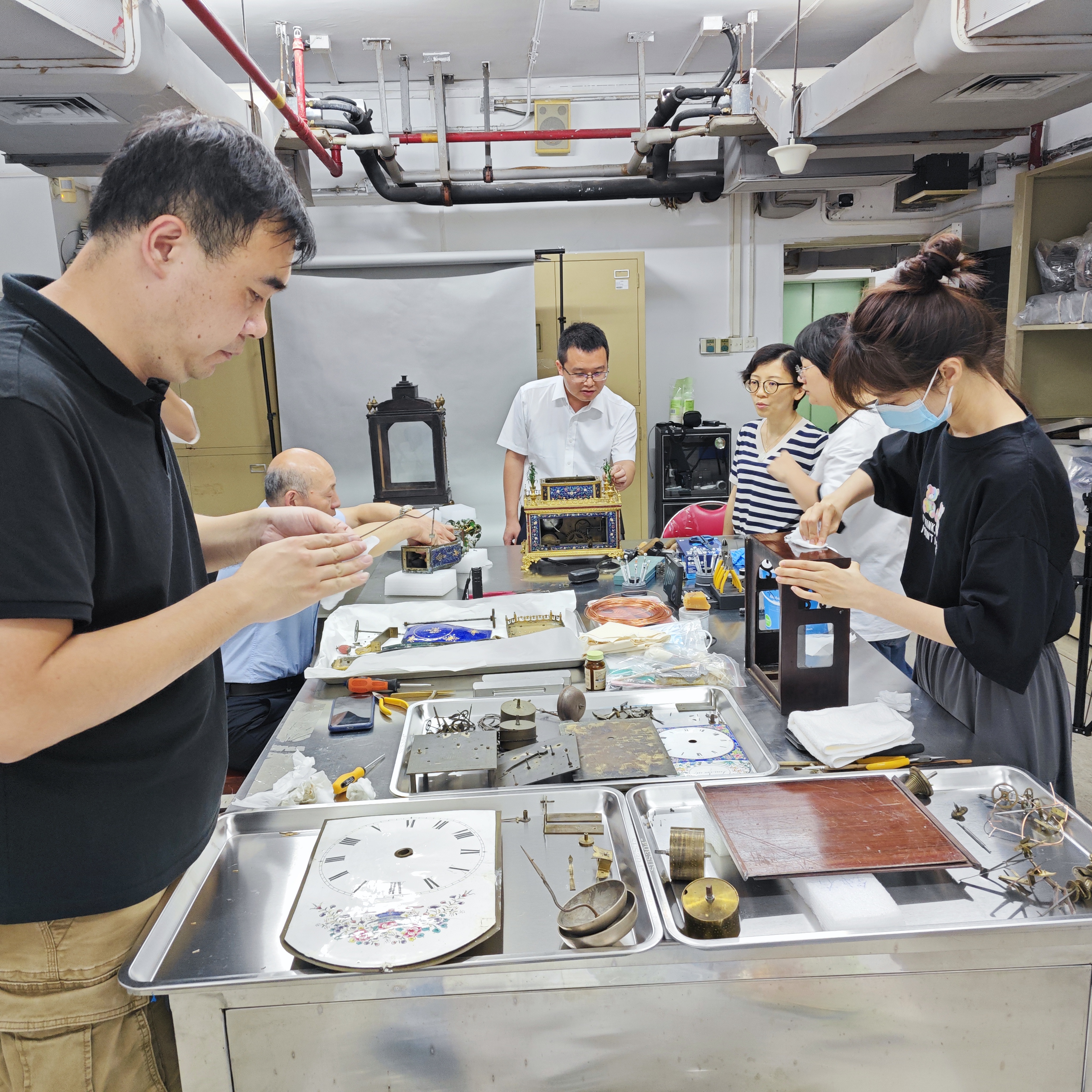 古钟表被小心翼翼地依次拆解,钟盘、机芯、料石、转花盘等拆卸下来的零件被有序地摆放在托盘内。每座钟表都是手工制造,形状、构造、功能各不同,出现的问题亦不相同,需要对症诊断,甚至修复师们将零件一个个拆卸、清洁、组装归位后,调试时仍然会出现不能预估的情况。