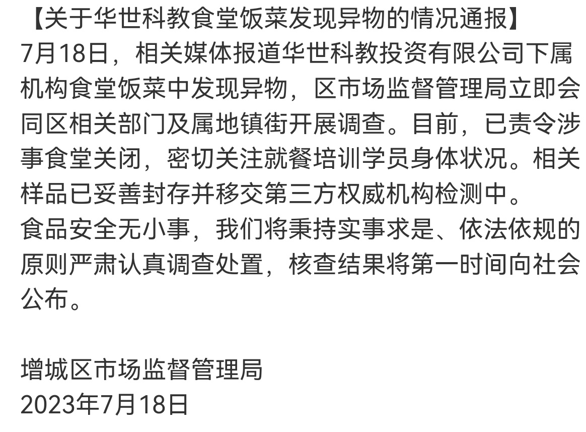 7月18日,相关媒体报道华世科教投资有限公司下属机构食堂饭菜中发现异物,增城区市场监督管理局立即会同区相关部门及属地镇街开展调查。目前,已责令涉事食堂关闭,密切关注就餐培训学员身体状况。相关样品已妥善封存并移交第三方权威机构检测中。