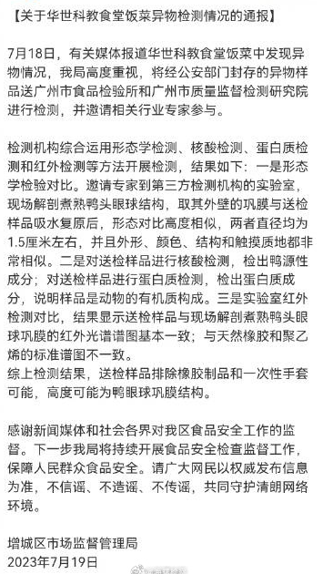 关于华世科教食堂饭菜异物检测情况的通报