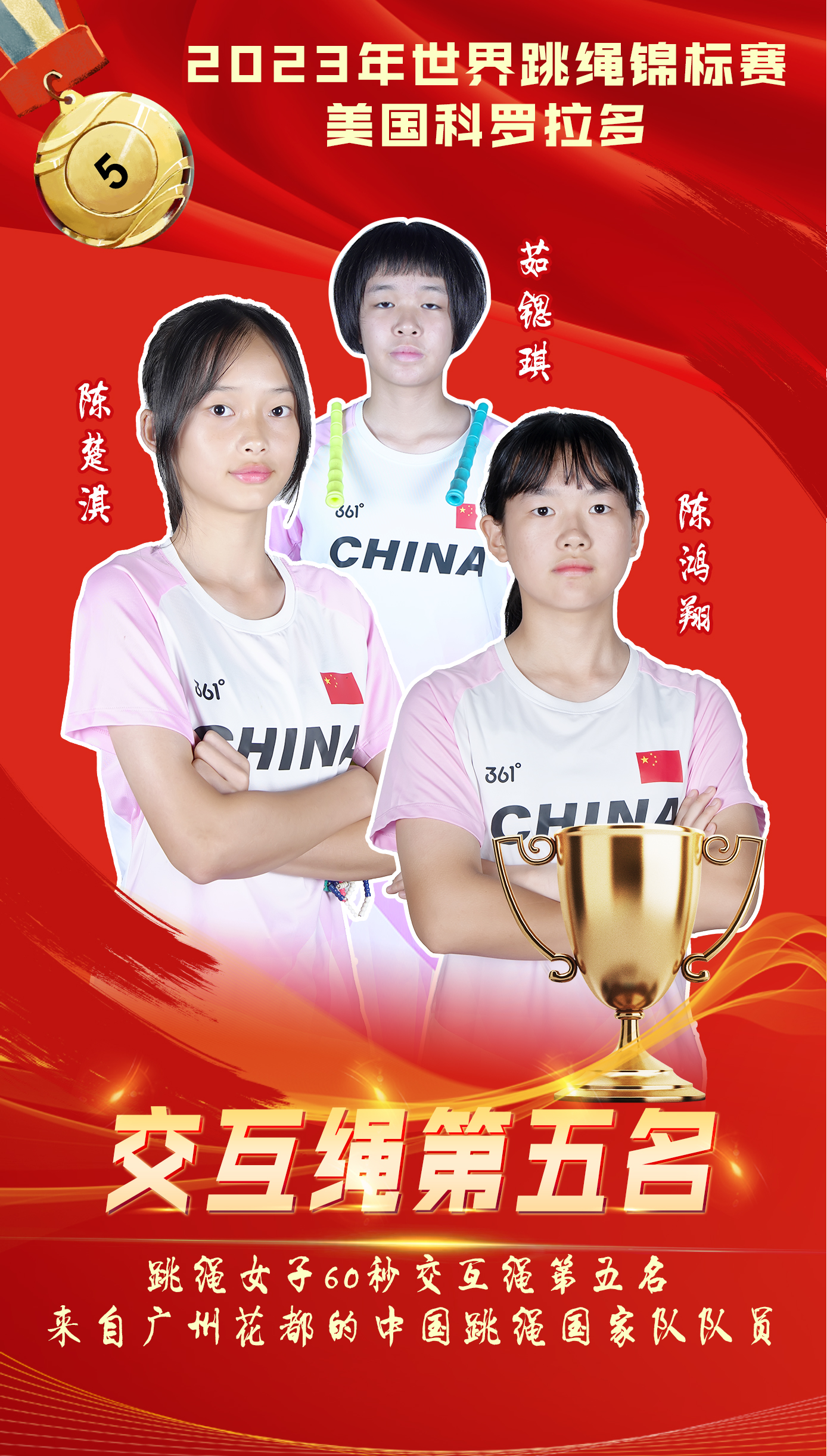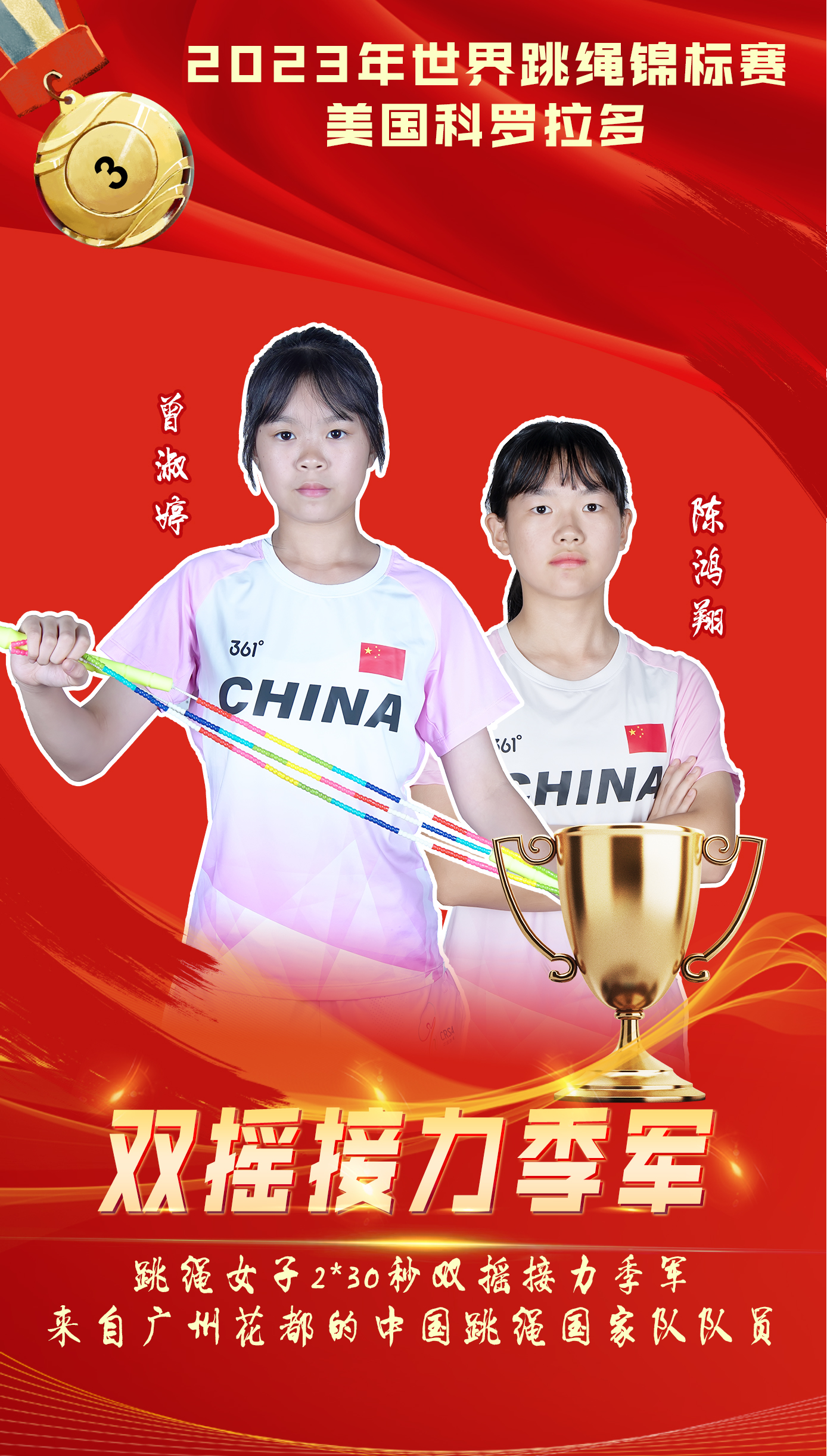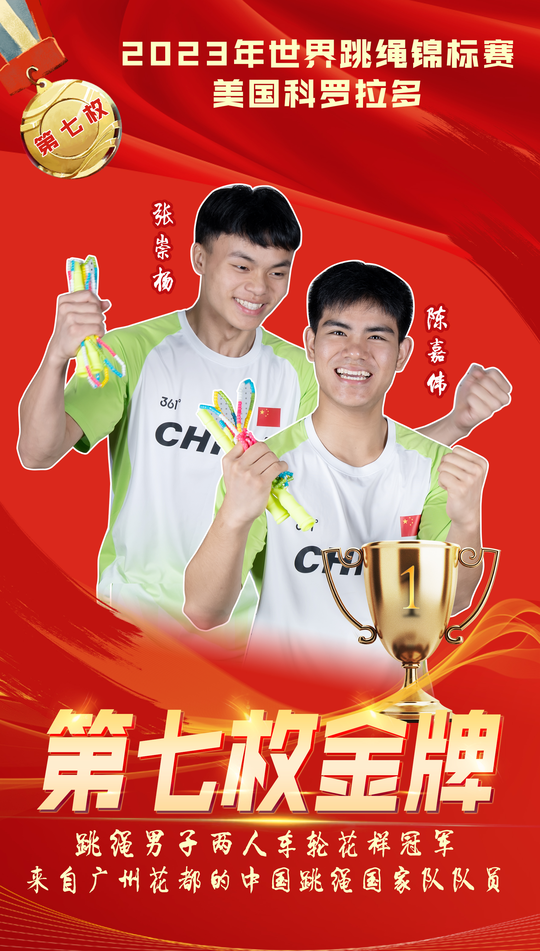 捷报频传!截至北京时间7月19日上午,在2023年世界跳绳锦标赛上,中国代表队共夺得9枚金牌,其中来自广州花都的中国跳绳国家队队员摘得7枚金牌,并打破1项世界纪录。