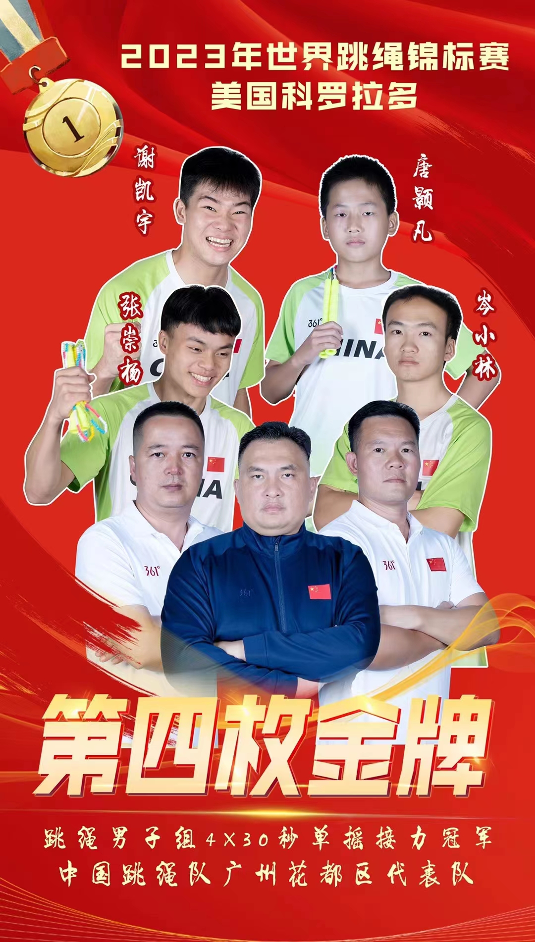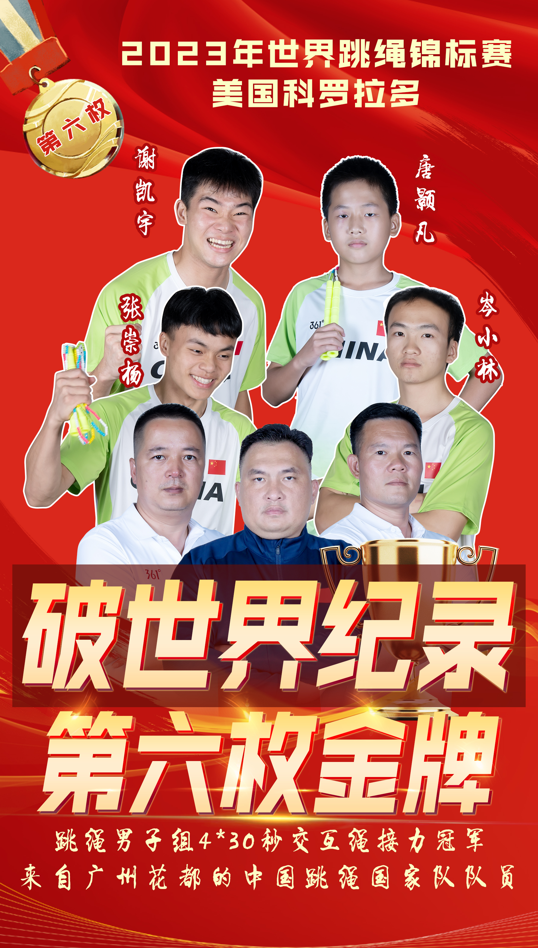 值得一提的是,谢凯宇、唐颢凡、张崇杨、岑小林夺得男子组4X30秒交互绳接力不仅夺得冠军,更是一举并打破世界纪录!