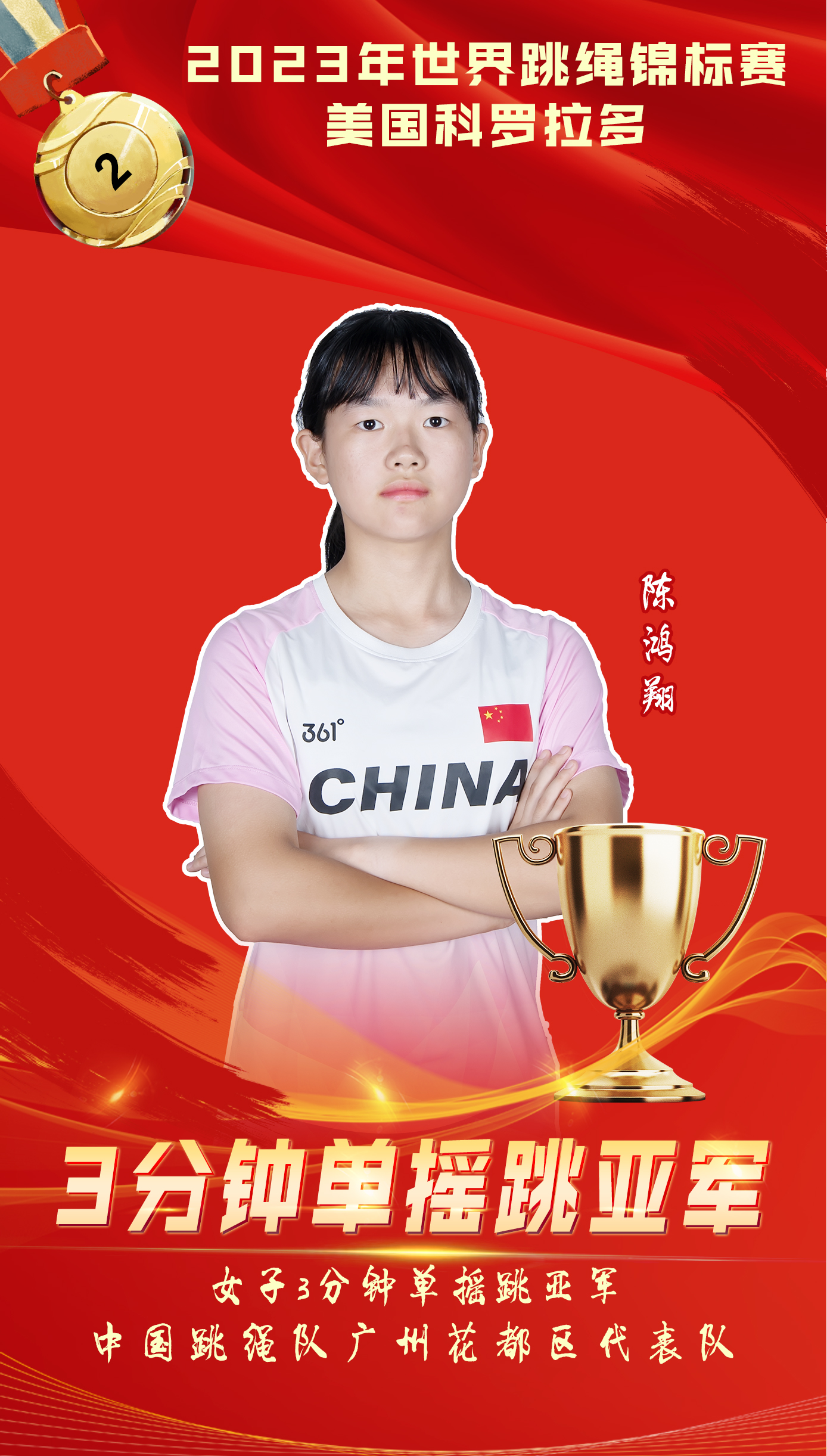 唐颢凡是本次花都代表队的最小队员,也是队员中唯一七星小学在读小学生,首次亮相国际赛事,目前已获得4枚金牌,夺金项目分别为4*30单摇接力、30秒单摇、2*30双摇接力、4*30交互绳接力,其中4*30交互绳接力打破世界纪录。