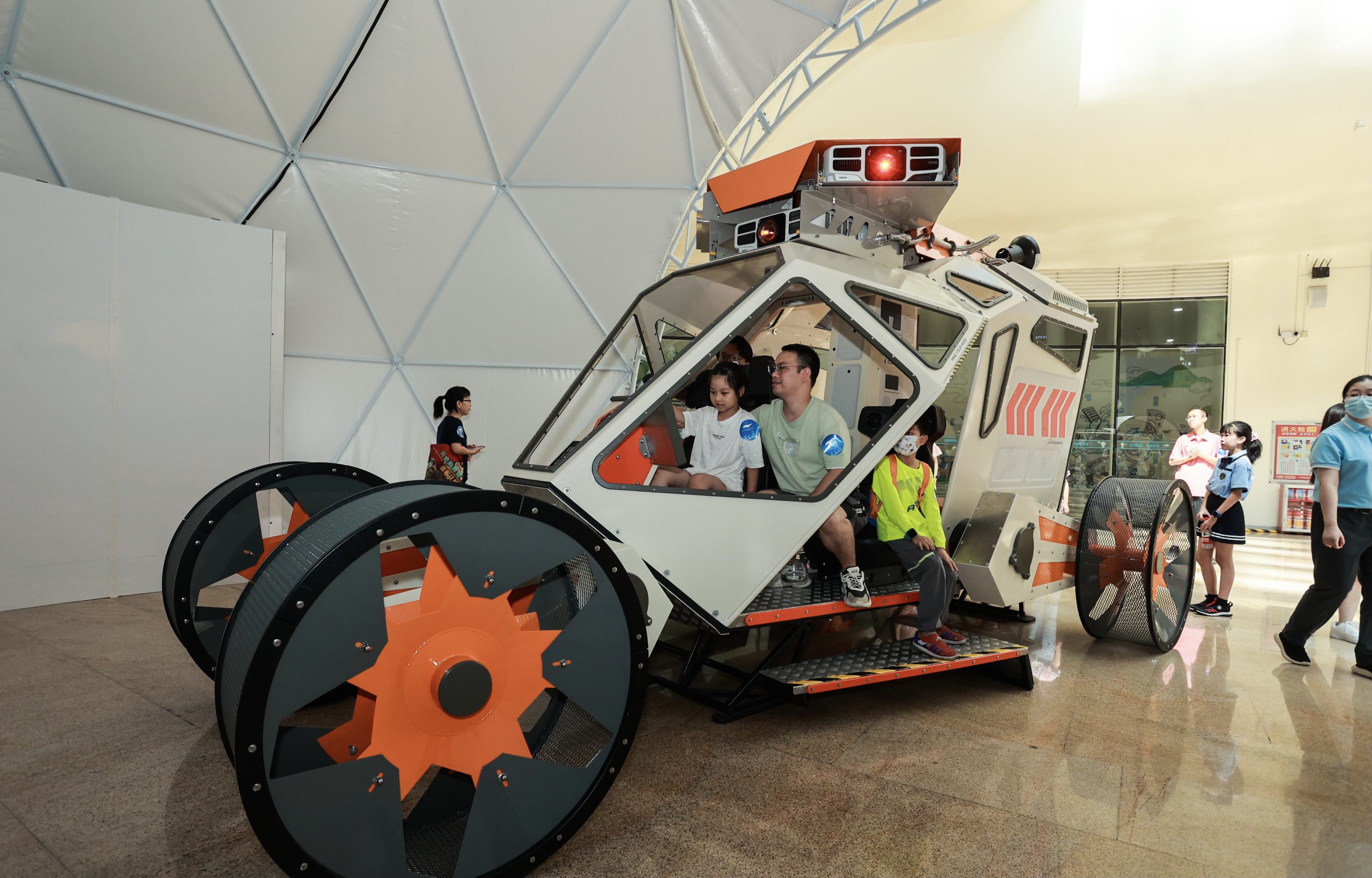 挑选太空旅行搭档,发射火箭,登陆行星寻找食物、住所,并解决各种问题……在展览现场,观众变身成为宇航员和探险家,和团队一起完成系列模拟探索行星的任务。在虚拟驾驶地表探测车展项,观众组成5人团队同时体验,1人驾驶车辆,2人通过车顶的红外摄像头扫描车外环境,另外2人以第三人称视角观看车辆行驶,团队齐心协力,沉浸式体验火星地表探索之旅。在扫描行星展项,观众可以向行星表面虚拟发射探测器,找到可能的冰和水的位置,模拟寻找适合居住的行星。同时,观众们还可以虚拟驾驶无人机在栖息地上空飞行,甚至可以现场虚拟种植太空土豆,通过选择正确的营养物质(肥料)、水和照明量,助力土豆在太空成长。