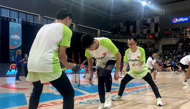 赛场上,花都队员们拼劲十足、斗志昂扬,教练赖宣治通过一声声指令,不断地为队员们调整跳绳节奏和姿态,共同向着胜利前进。