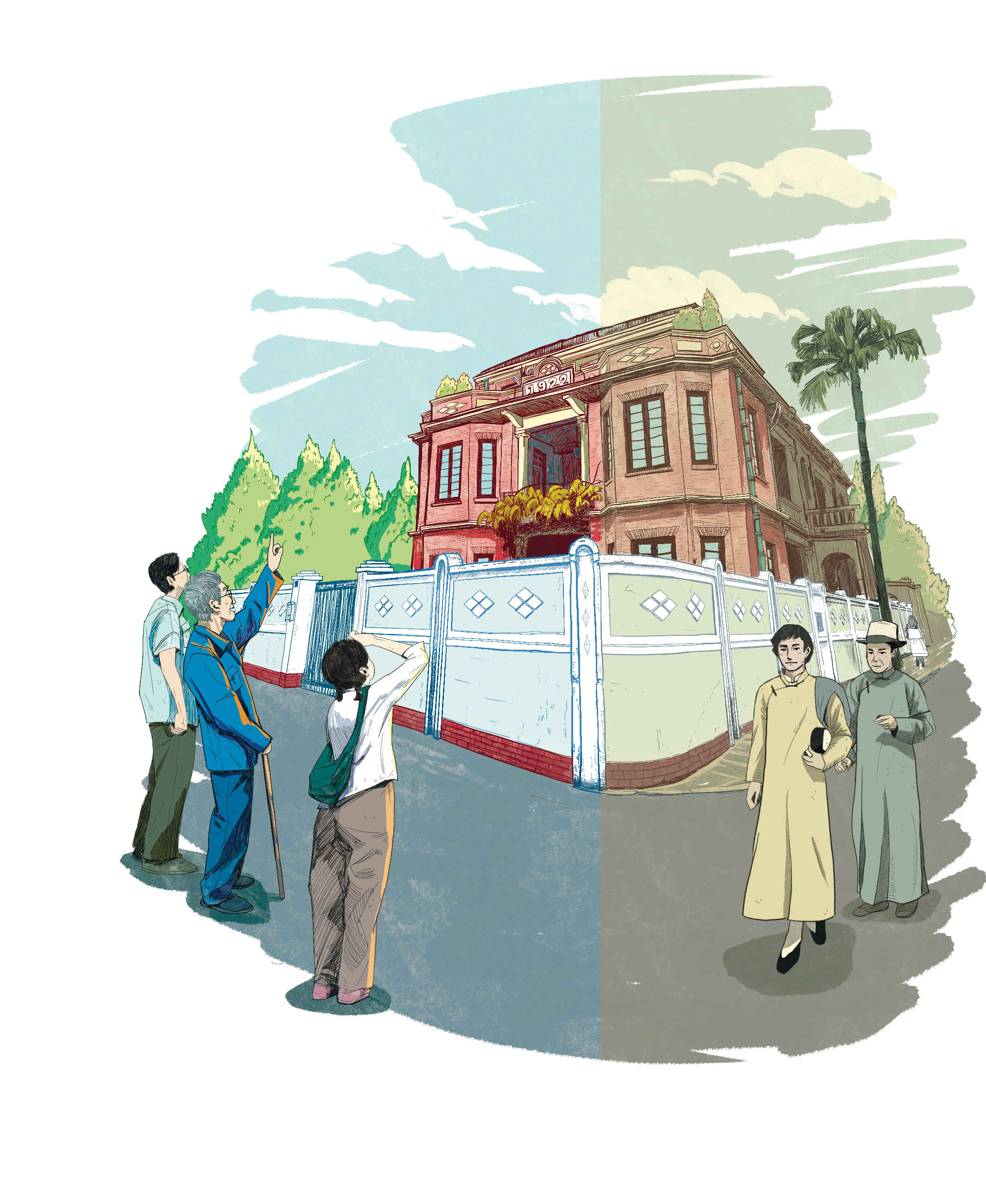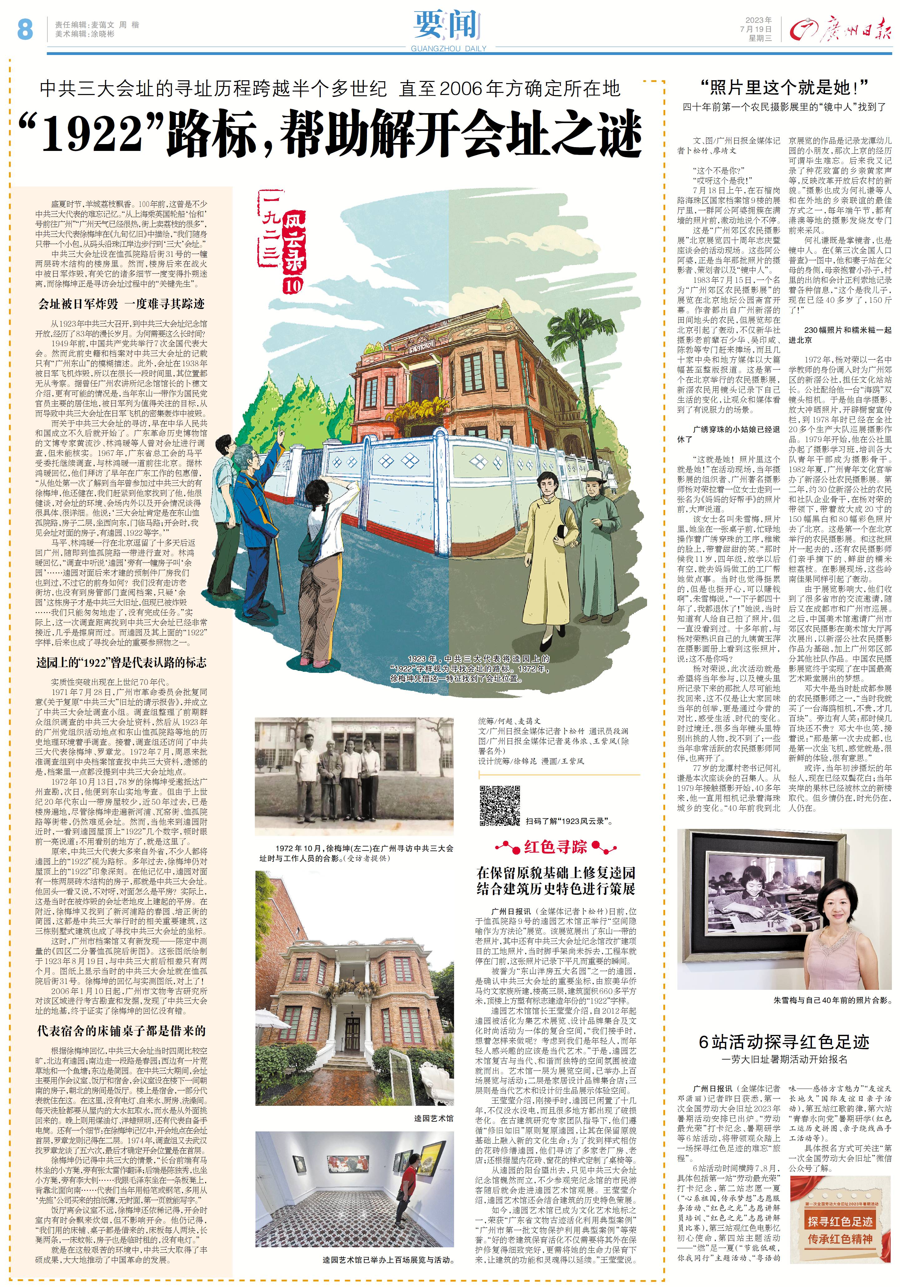 原来,中共三大代表大多来自外省,不少人都将逵园上的“1922”视为路标。多年过去,徐梅坤仍对屋顶上的“1922”印象深刻。在他记忆中,逵园对面有一栋两层砖木结构的房子,那就是中共三大会址。他回头一看又说,不对呀,对面怎么是平房?实际上,这是当时在被炸毁的会址老地皮上建起的平房。在附近,徐梅坤又找到了新河浦路的春园、培正街的简园,这都是中共三大举行时的相关重要建筑,这三栋别墅式建筑也成了寻找中共三大会址的坐标。