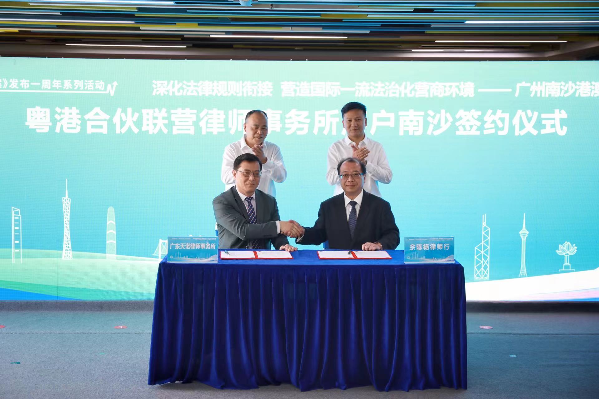 活动当天,两大合伙联营律师所同日落户南沙。南沙区司法局相关负责人为粤澳合伙联营律师事务所——国智君联(南沙)联营律师事务所颁证,并与广州市律师协会副会长陈健斌共同见证广东天诺律师事务所与香港余陈杨律师行双方在活动现场签约设立粤港合伙联营律师事务所。
