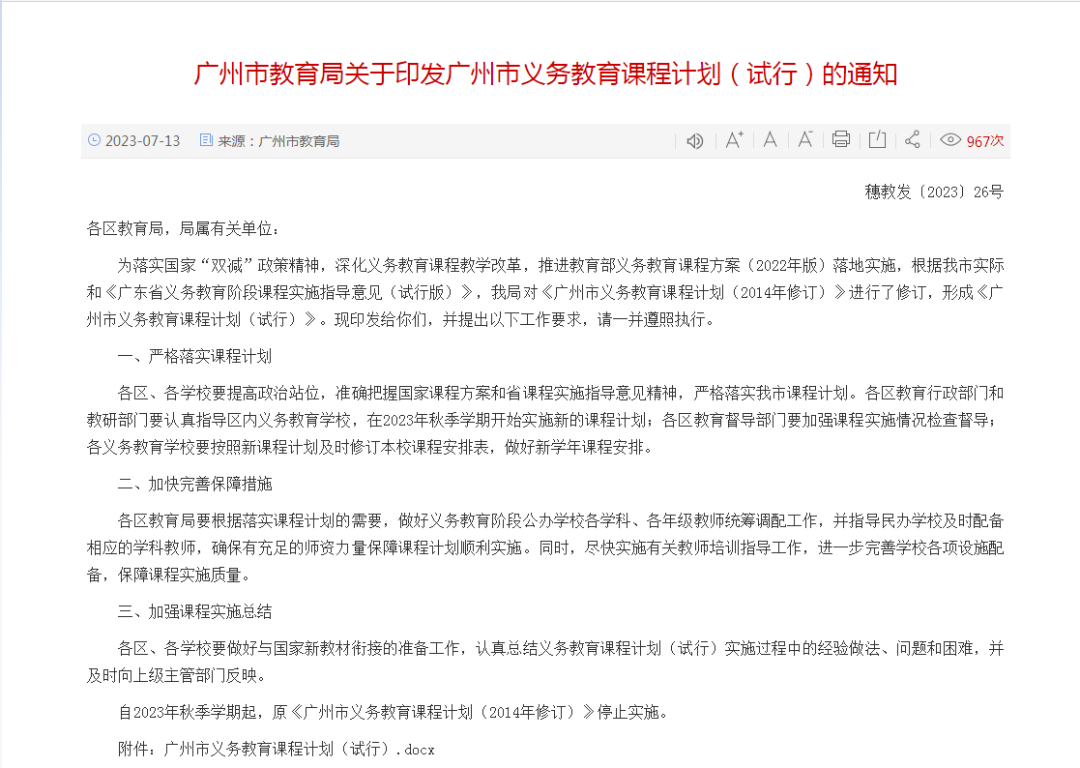 《广州市义务教育课程计划(试行)》包含课程计划表及说明,课程计划表主要按照国家课程、地方课程、校本课程对年级、学科进行分类,明确各学科每周的课时数及各年级周课时总数。