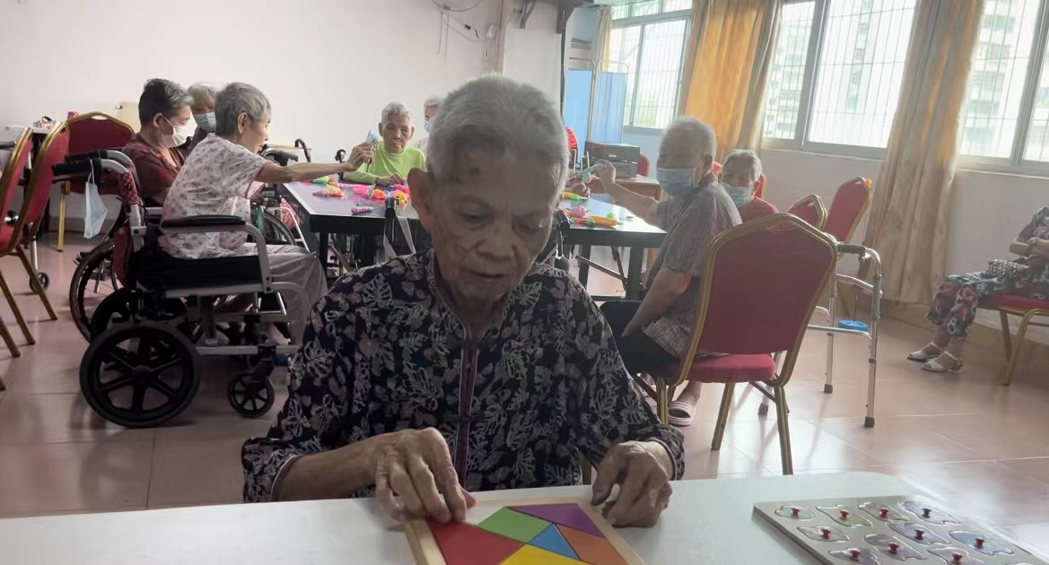 下午3时,午休起床后的谢燕娥又在护理人员的带领下来到娱乐室开展康体活动,不论是拼积木,还是玩乐高玩具,老人都玩得不亦乐乎。一个小时候,老人又去和其他伙伴一起看电视去了。