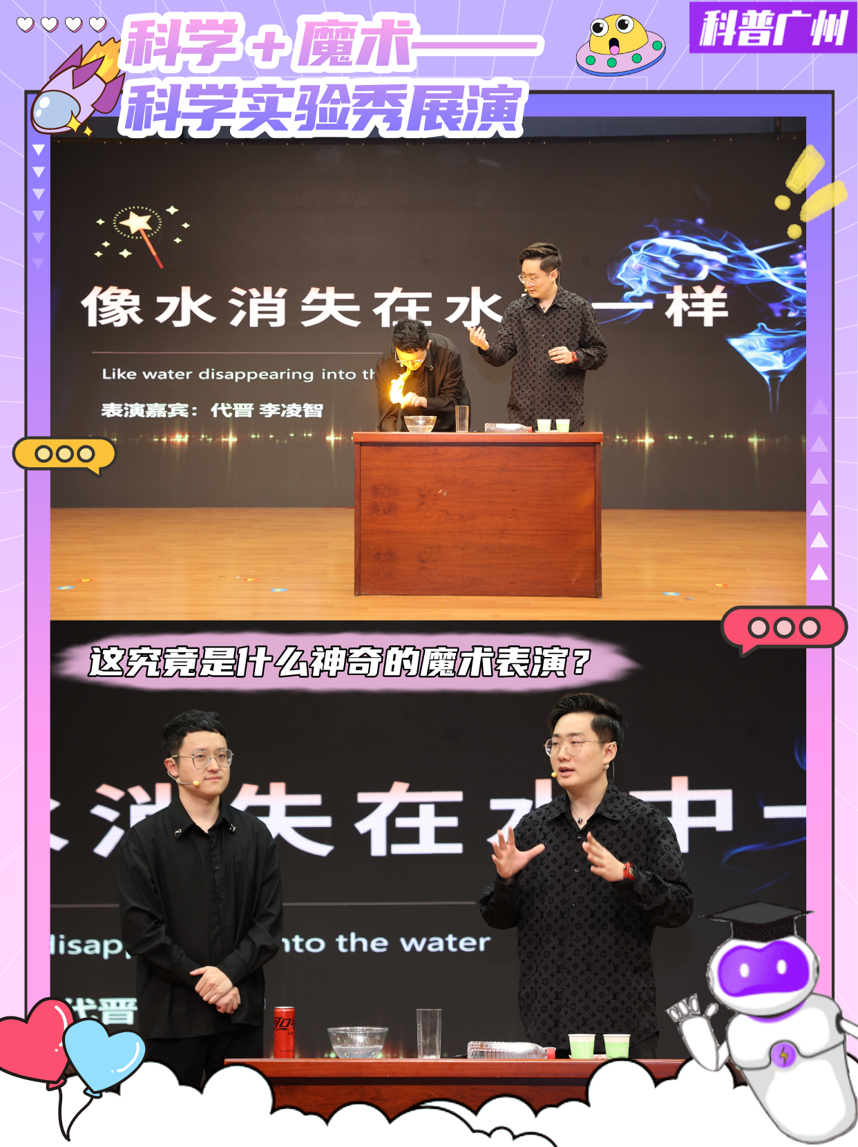 活动还为参赛者“打版”——两位“科学魔术师”带来了科学实验展演和科学原理解读,通过一个个有趣的实验,激发小朋友们对科学的兴趣。