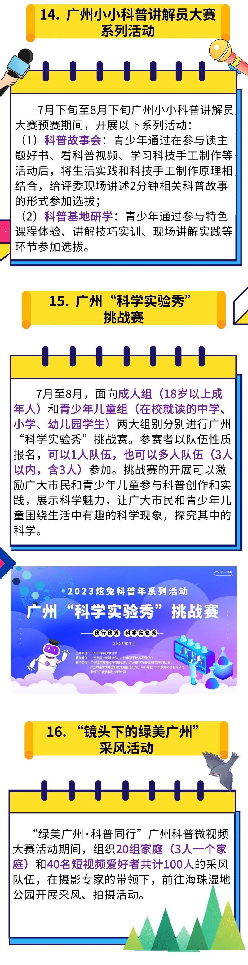 据悉,广州“科学实验秀”挑战赛将于2023年7-11月期间举行。本次大赛将分为线上初赛、半决赛,以及线下决赛展演,共有成人组和青少年儿童组两个组别,每队队员人数可有1-3人。