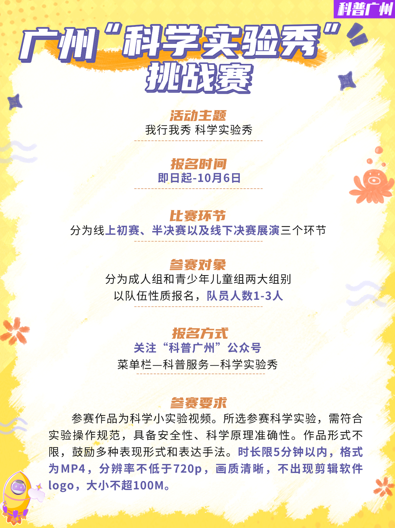 目前,大赛正征集参赛作品即科学小实验视频。所选参赛科学实验,需符合实验操作规范,具备安全性、科学原理准确性。作品形式不限,鼓励多种表现形式和表达手法。参赛视频时长限5分钟以内,格式为MP4,分辨率不低于720p,要求画质清晰,不出现剪辑软件logo,大小不超100M。具体参赛方式可关注“科普广州”公众号了解详情。