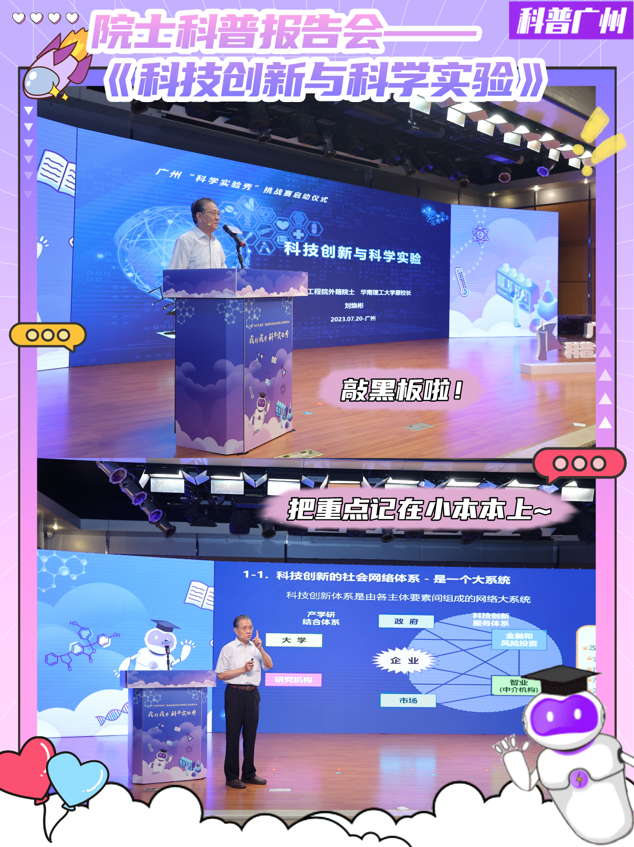 活动也邀请了俄罗斯工程院外籍院士、华南理工大学原校长刘焕彬以《科技创新与科学实验》为题作院士科普报告。他从自身的科技创新实践经历出发,为大众科普科技创新与科学实验之间的关系。刘焕彬强调,科学发现离不开科学实验,科学实验既是科技创新的重要手段,也是培养科技创新能力的途径。