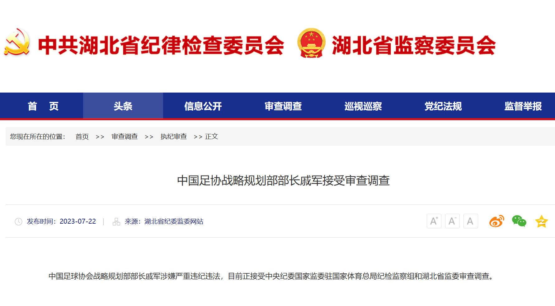 中国足协技术部部长谭海、战略规划部部长戚军接受审查调查