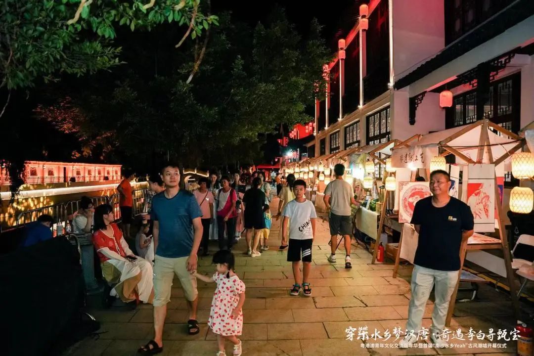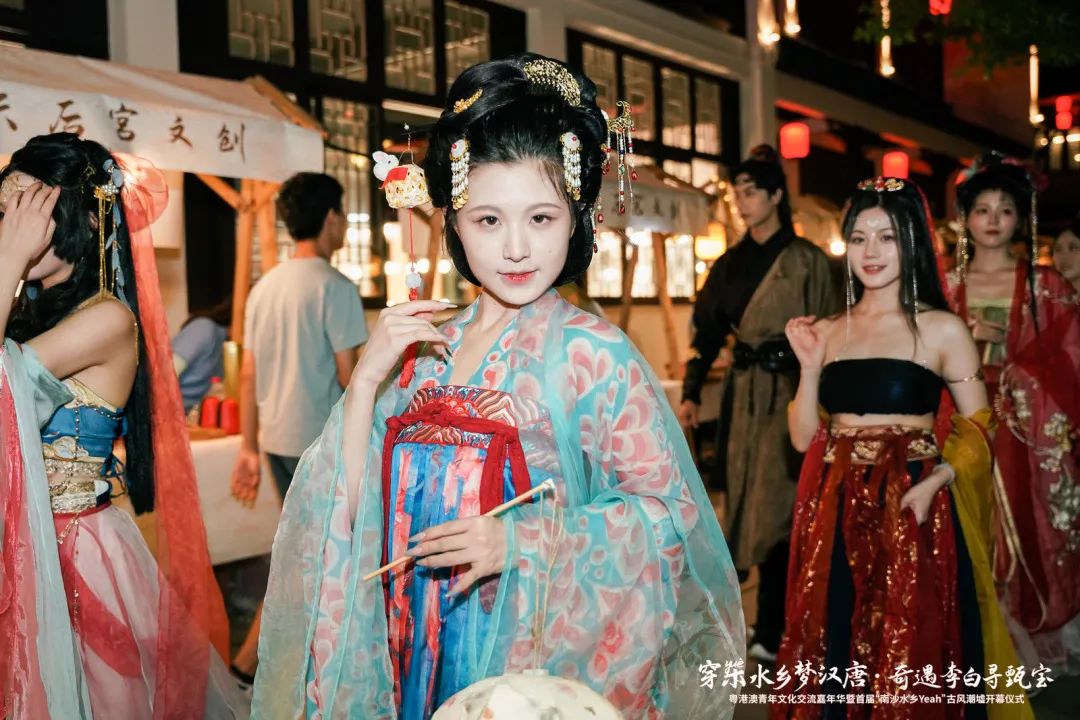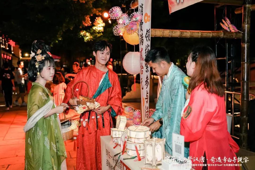 水乡一条街自然风景优美,建筑风格独具特色,活动依托环境要素,打造古风氛围,通过主题场景营造,形成多维沉浸式古风市集,让来自粤港澳大湾区的各界人士沉浸式感受盛世时期的繁华。所有参与活动的嘉宾、游客以及工作人员都身着汉服,穿梭在水乡一条街,现场灯光璀璨,照在游客的脸上,古今交汇间,一切仿佛都回到盛世。