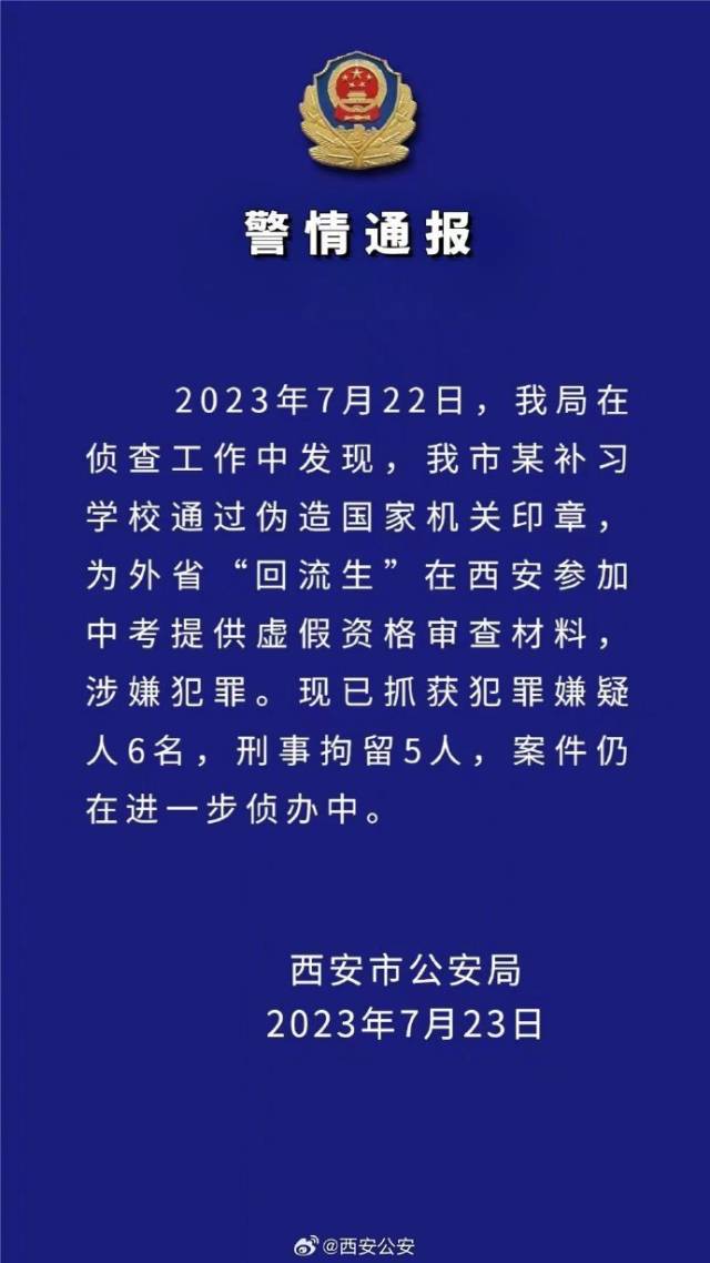 2023年7月22日,我局在侦查工作中发现,我市某补习学校通过伪造国家机关印章,为外省“回流生”在西安参加中考提供虚假资格审查材料,涉嫌犯罪。现已抓获犯罪嫌疑人6名,刑事拘留5人,案件仍在进一步侦办中。