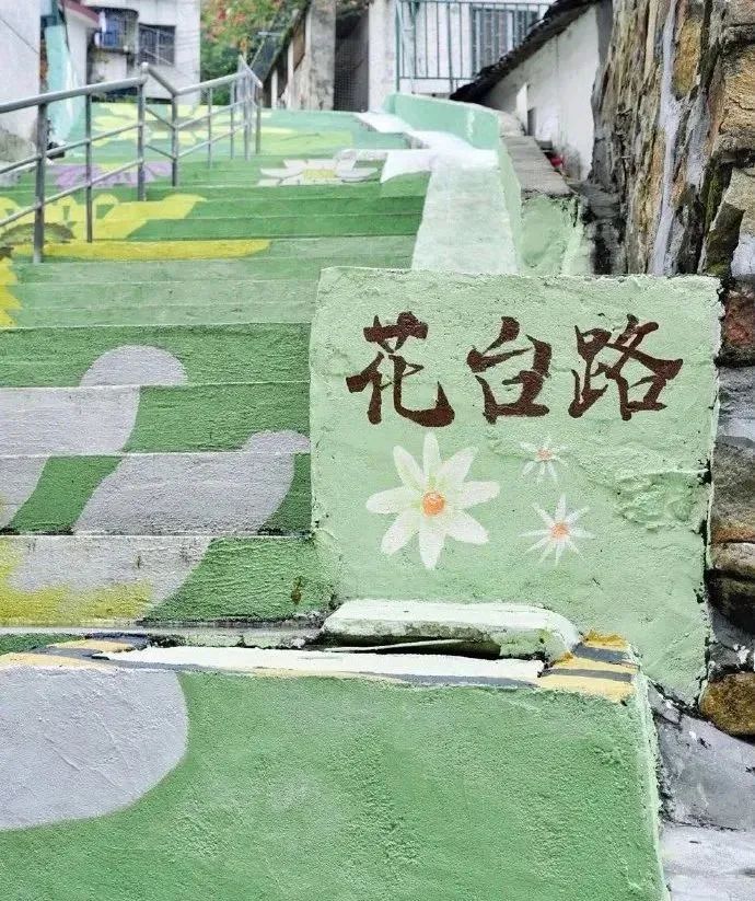 其中南虹路、海贝路和花台路三条层次感十足的叠式阶梯最为夺目,南虹路是一条彩虹的石阶;海贝路描绘了深蓝的海洋世界,一条巨型鲸鱼悠游盘旋;花台路以花为主题,大朵洋甘菊给人强烈的视觉震撼,美好的夏日气息扑面而来。