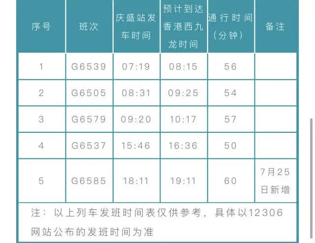 G6585次高鐵:18:11時慶盛站至香港西九龍站。