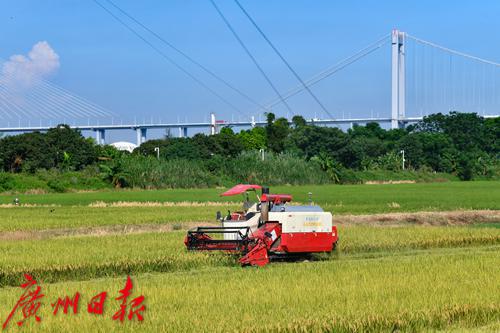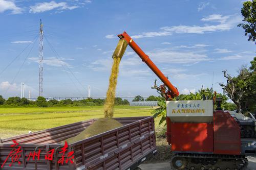 7月24日,大吉沙华南农业大学黄埔创新研究院智慧农场在烈日下开始了早稻收割,无人驾驶收割机在金黄色的稻田中来回收割,装满稻谷后回到田边将稻谷转运到无人驾驶运粮车上,再由运粮车转运到货车上。当天,罗锡文院士也在现场视察收割情况。