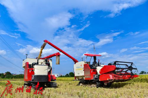 无人农机在田间收割早稻。