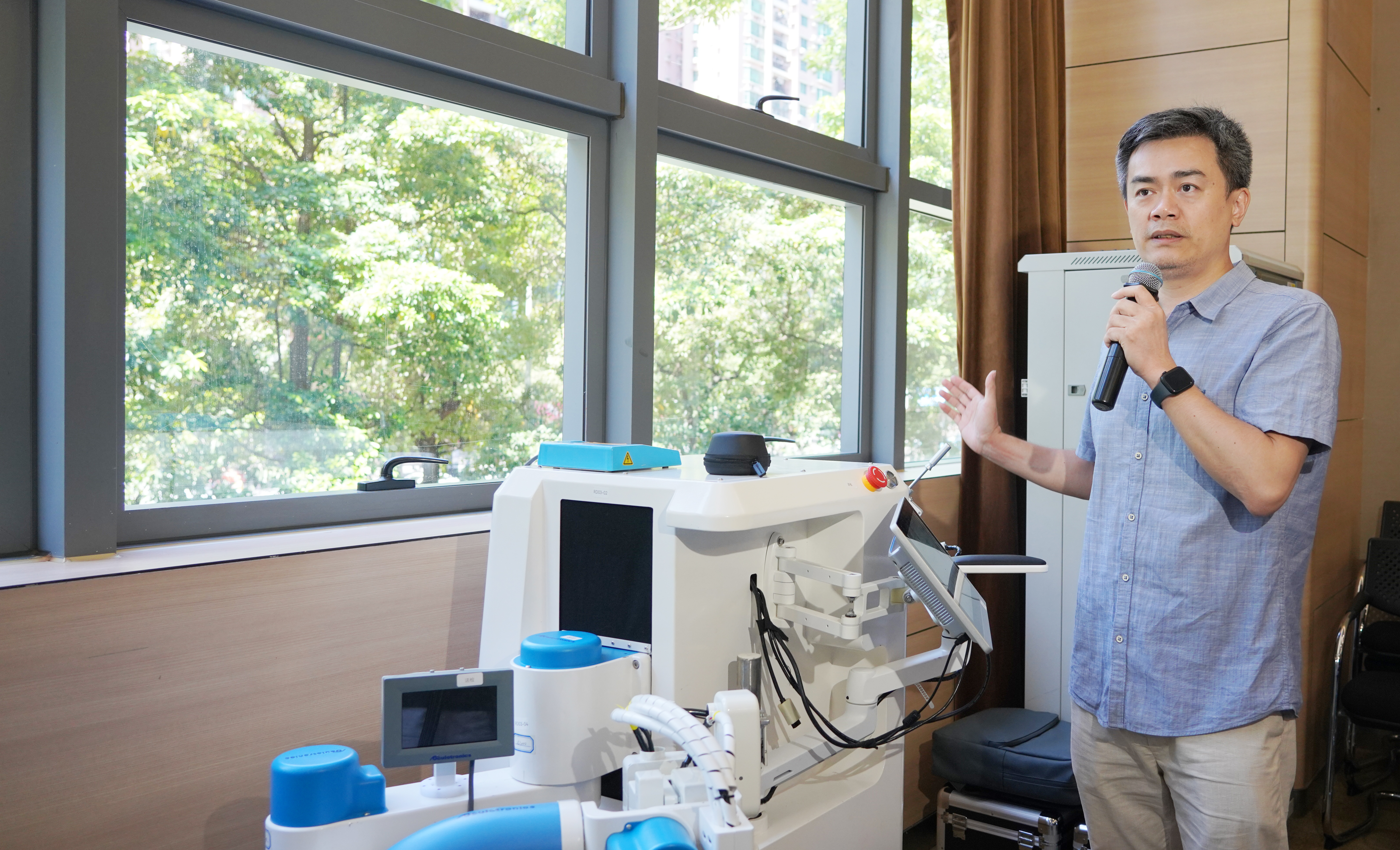 站立在机器人面前,黄凯教授介绍,这次医工交叉创新团队通过多学科融合、软硬件协同开发的方式,全自主研发出眼科手术机器人的关键部件——独特的串并联构型机器臂结构,可以实现微米级精度的远程运动中心(RCM)控制和末端重复定位。该机器人能够模拟和替代人手操作,过滤人手震颤和抖动,并通过5G远程通信技术实现跨空间限制的高精度手术操作。