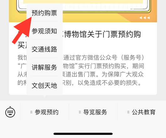 2. 子菜单选择参观预约-预约购票,按照指引进行操作