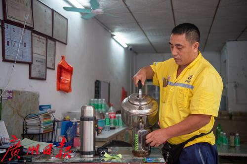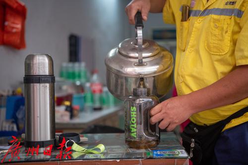 今年入夏以来,南方天气持续高温,烈日下室外温度已超38℃以上,而这位年过45岁的大叔每天要扛起400多公斤的气罐,徒步爬楼数十层。每次送气前,吴海清都将两个大水壶放在三轮车上,一个是不锈钢保温壶,装冰水;另一个“大肚”水壶,装茶水。