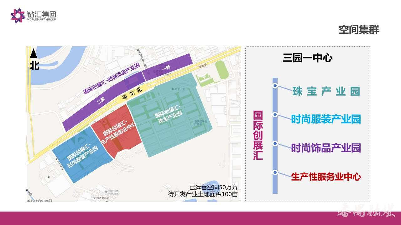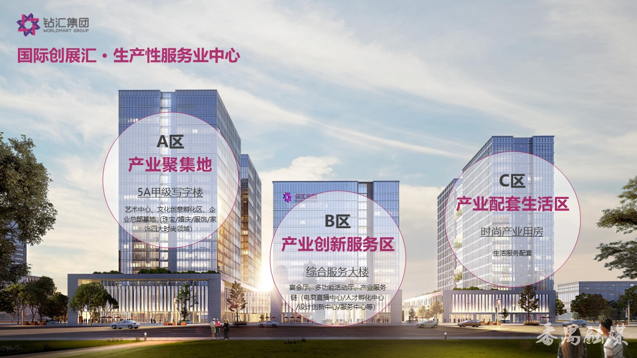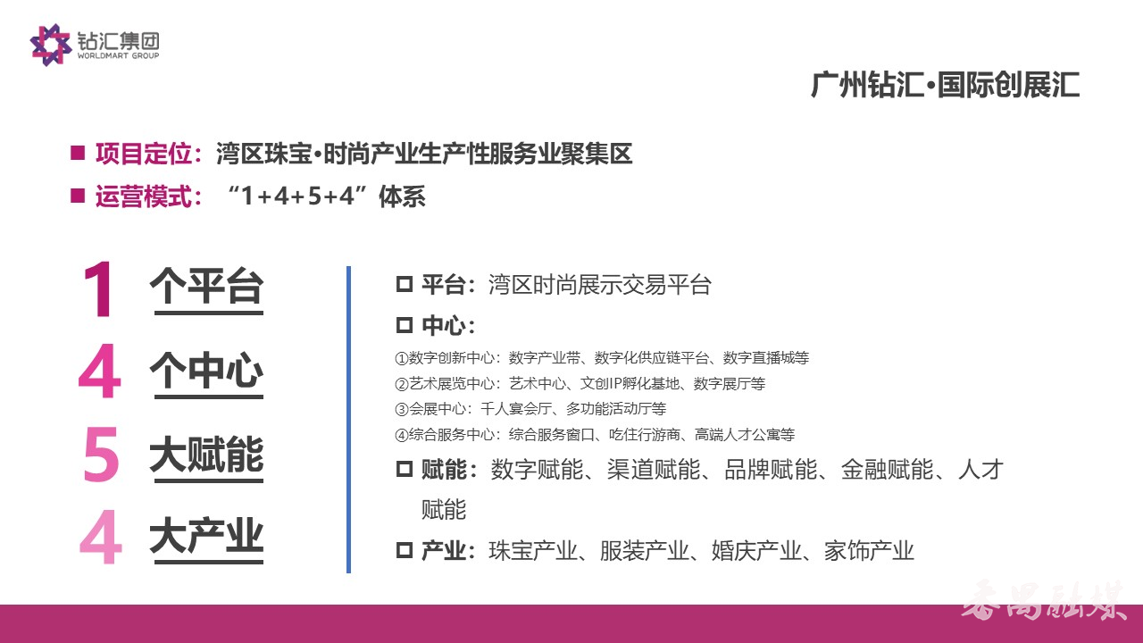 “广州钻汇·国际创展汇”不仅具备“三园一中心”(珠宝产业园、时尚服装产业园、时尚饰品产业园、生产性服务业中心)的空间功能,还建立了“1+4+5+4”的运营服务体系,通过品牌、渠道、人才、金融、数字化手段为企业提高效能。