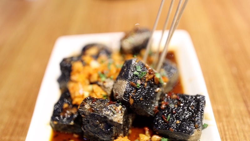 而经过炒制之后的辣椒,则更多的是作为“点睛之笔”出现在不同的长沙小吃当中。以长沙最“耳熟能详”的小吃——臭豆腐为例,路边的推着一辆三轮车的娭毑(老奶奶),在车上的炉子架起一口大锅,旁边用小簸箕中承放着制好的臭豆腐,等到锅中的油一热,娭毑的油炸臭豆腐的生意就开张了。当旁边的食客要上一份臭豆腐,娭毑则一片一片将制好的臭豆腐放入大锅中的热油中,油锅中的臭豆腐的上下翻动,不一会儿方块形状的臭豆腐就胀起了“肚腩”,臭豆腐最外面的一层变得酥脆,而中空的部分则还保留着臭豆腐的原汁原味,差不多一分钟过后,一片片炸好的臭豆腐出锅后放在锅上的沥油处放凉、变酥,之后随意将腌制的萝卜干、蒜末、香菜一股脑塞进臭豆腐破开的“肚腩”中,淋上“点睛”的辣椒酱汁,一口将“大腹翩翩”的臭豆腐塞入嘴中,臭豆腐外皮的酥脆、混合着所有食材的香味全部充溢到口腔和鼻腔,瞬间有了提神醒脑、流连忘返之感。