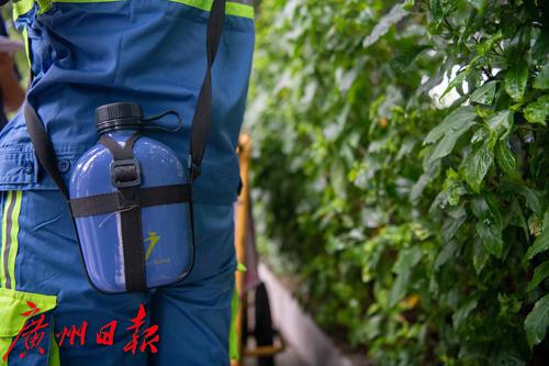 环卫工人张羽仙背着水壶。