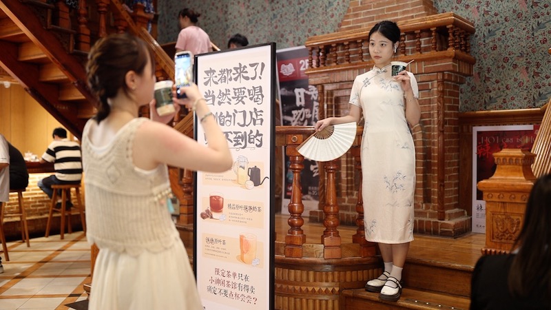 位于长沙市开福区中山亭东南侧,有一家装修十分有特色的茶颜悦色,吸引了众多年轻人穿上自己喜欢的汉服或是民国风服饰,前来这家店内“打卡”。进入其中,其中的仿古装修搭配上服饰各异的年轻人,的确非常“出片”。此外,店内三层的设计,也让品牌周边有了“出圈”的可能,除了一楼是常规的奶茶店以外,在二楼还进行“日咖夜酒”的设计,白天茶颜悦色的咖啡品牌鸳央咖啡,晚上则成了鸡尾酒酒吧。